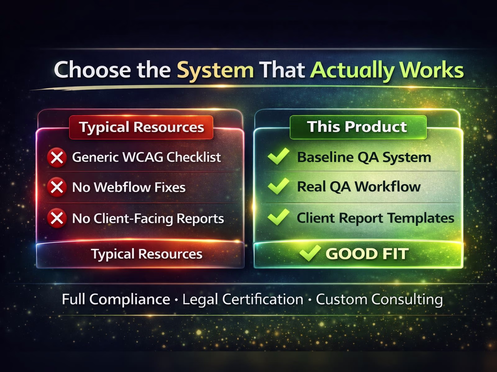 Inside, you’ll get a Webflow-specific checklist workbook, a step-by-step QA workflow, reusable fix patterns, editable report templates, email templates, and supporting documentation designed to make your process faster, cleaner, and easier to repeat.