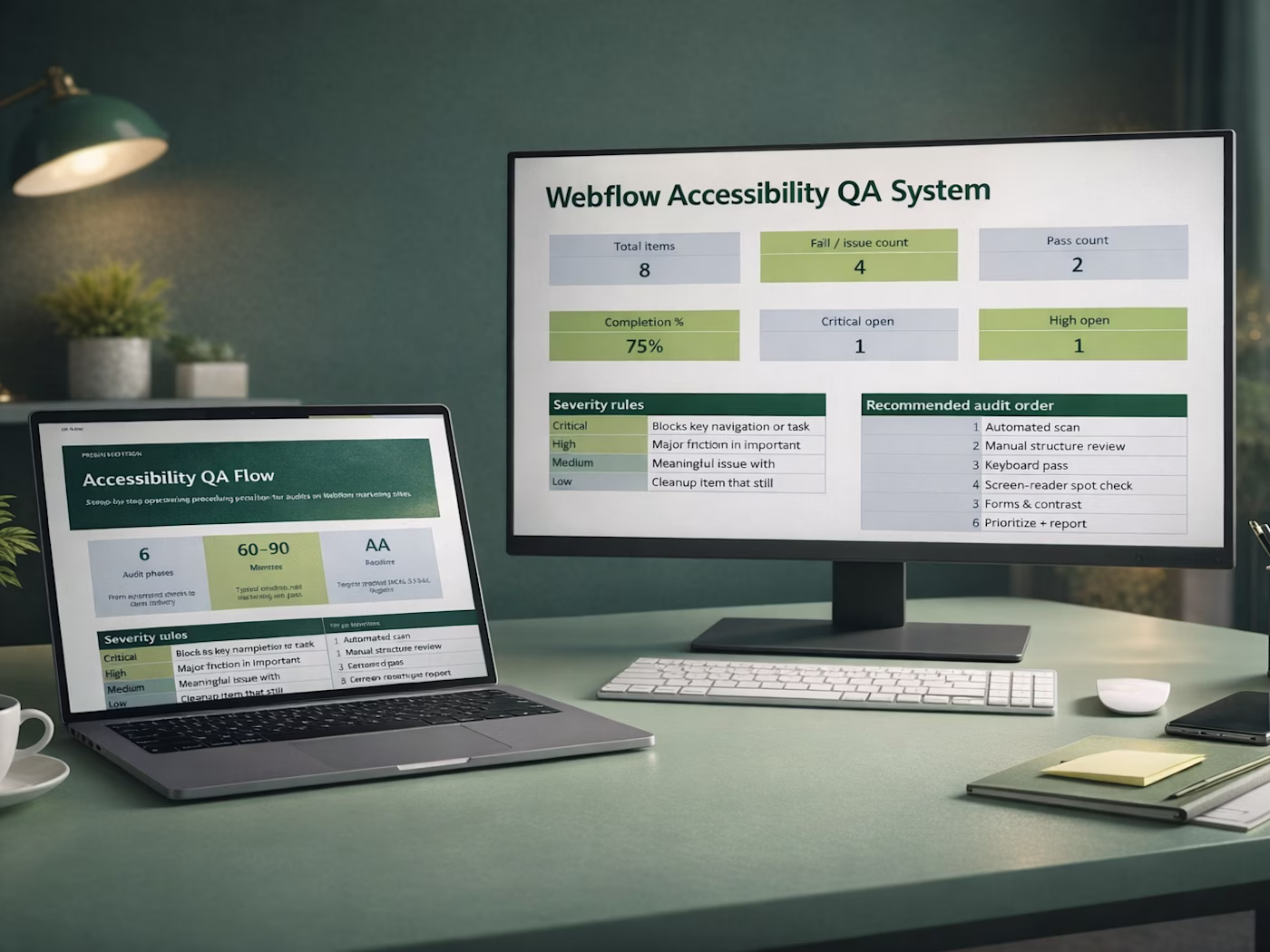 A branded audit workbook with a dashboard, a blank audit sheet, and a completed example so you know exactly what a finished pass looks like. A step-by-step QA flow that tells you what to check, in what order, and how to prioritize findings without getting lost in WCAG theory. A Webflow-specific fix pattern library that takes you from identified issue to practical remediation without guessing. A tools guide covering Lighthouse, axe, WAVE, contrast checks, keyboard testing, and screen-reader spot checks — with clear notes on where automated tools stop being enough. A client-ready report template designed to look expensive and credible without overpromising scope. Email templates for delivery, scope-setting, and follow-on upsell conversations. A finished sample report showing exactly how a real baseline audit output should look when handed to a client.