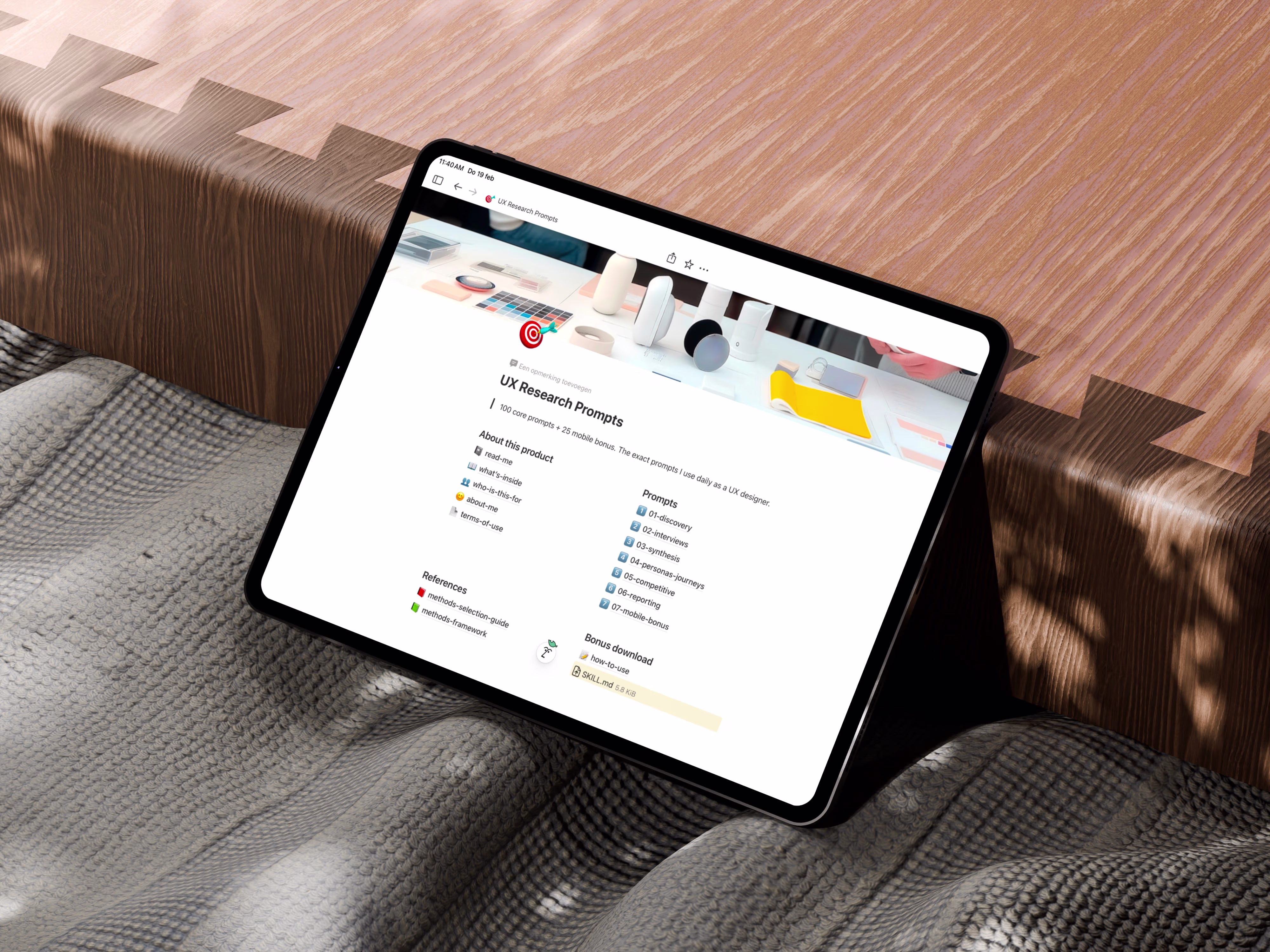 This is my personal prompt library. The same prompts I run on every client project, from stakeholder kickoffs to final presentations. 15 years of UX research, distilled into ready-to-use templates.