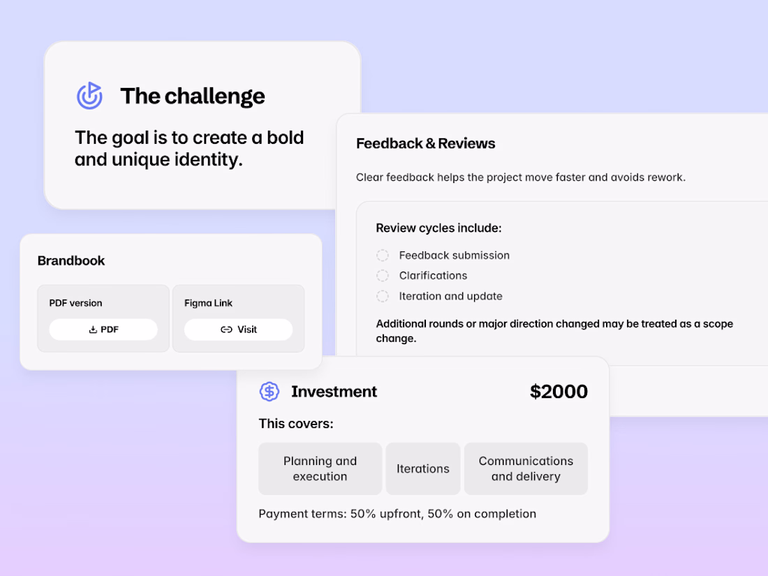 This project is a Framer-based, client-ready workspace designed for freelancers once they’ve already landed an opportunity. Instead of sending scattered PDFs, emails, and links, freelancers duplicate this website per project and share a single, structured workspace with their client.