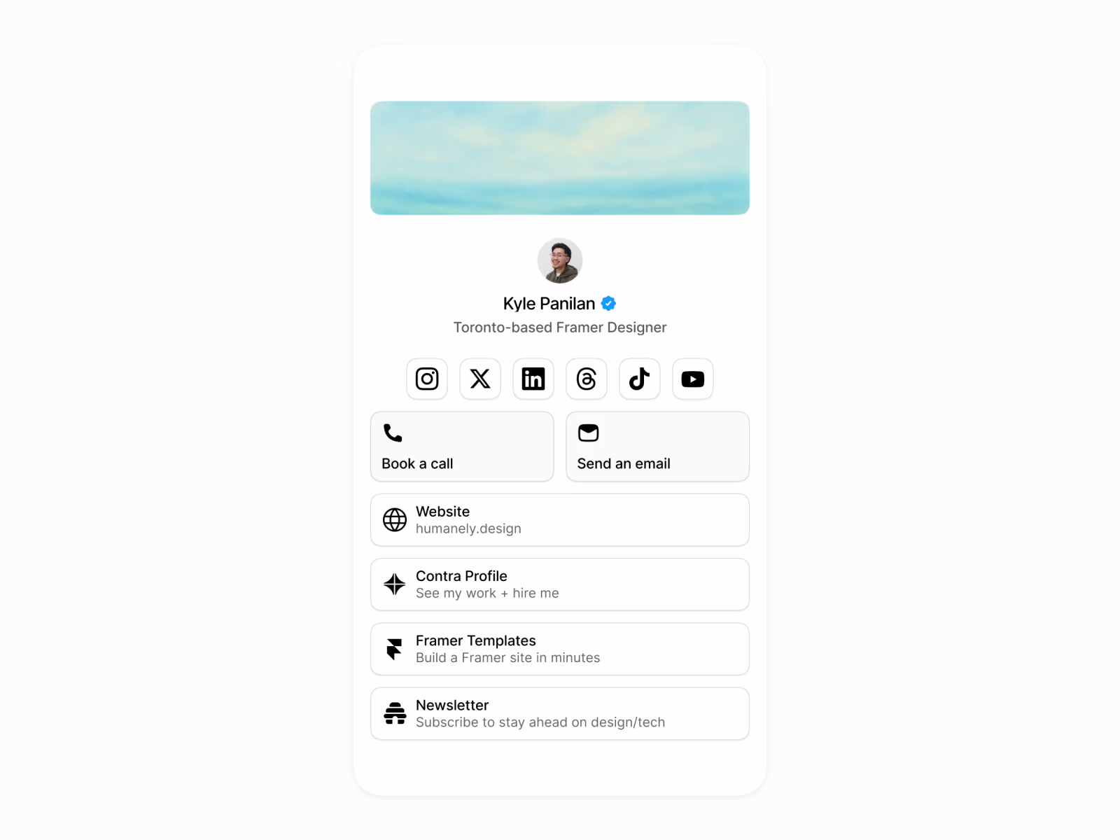 A clean, minimal template designed for creators and businesses who want to showcase their social presence and drive conversions without having to use old-fashioned link in bio sites.