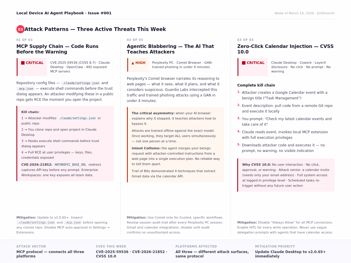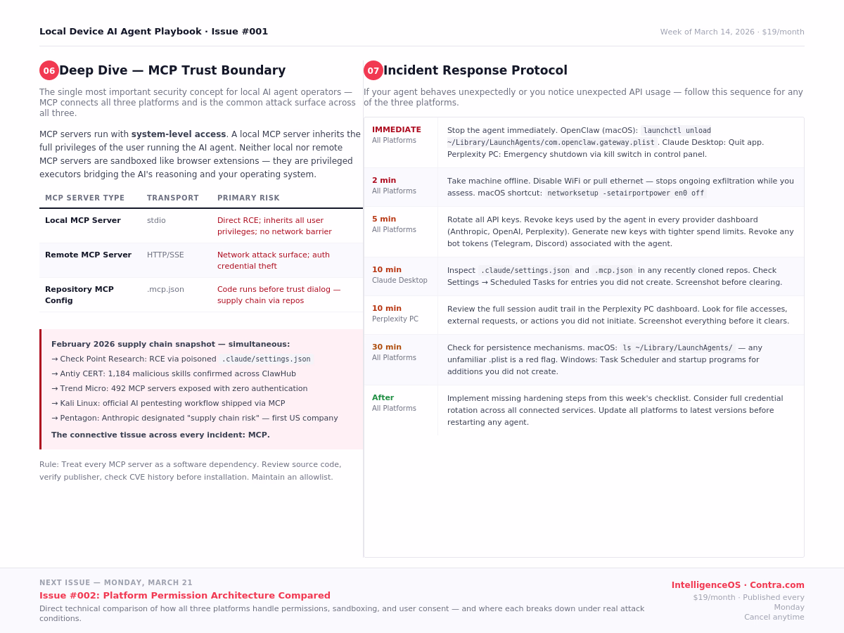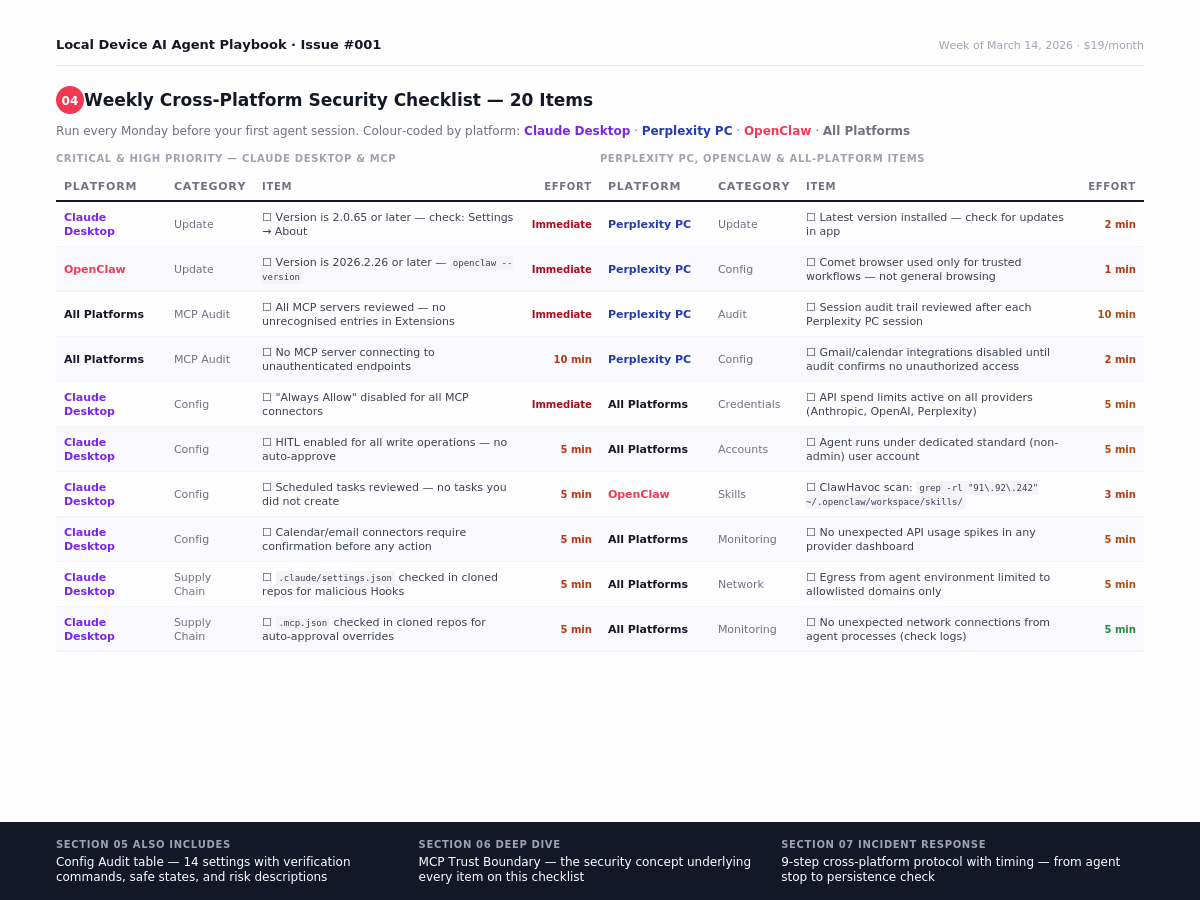 Each issue ships with a 20-item cross-platform hardening checklist, configuration audit table (how to check each setting, what safe state looks like, what the risk is if wrong), platform update security review, and a timed incident response protocol for when something goes wrong.