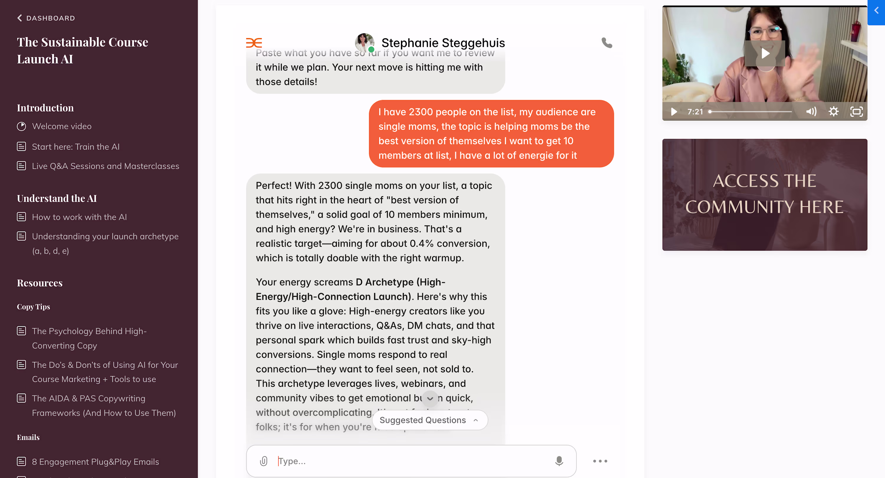 The Sustainable Course Launch AI is a personalised launch strategist you can access 24/7, plus monthly live group consulting with Stephanie.