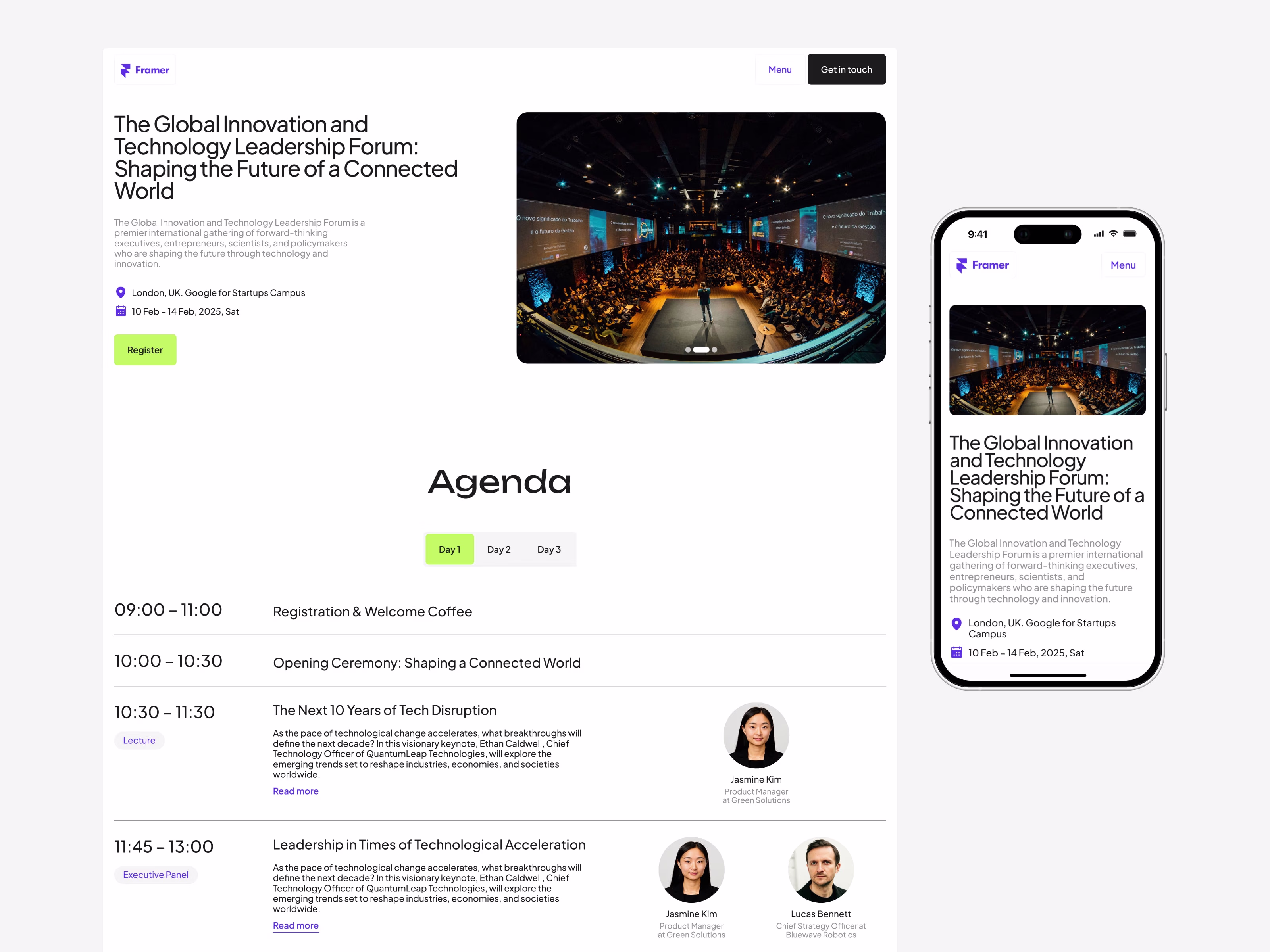 Eventas is a structured, design-conscious Framer template crafted for event organizers, community builders, and professional networks. Built with intuitive UX principles and practical layout design, it helps you present events, speakers, partners, and testimonials in a clear, organized way, all without writing a single line of code. The template also comes with Figma social media layouts for LinkedIn and Instagram, making it easy to extend your event branding beyond the website.
