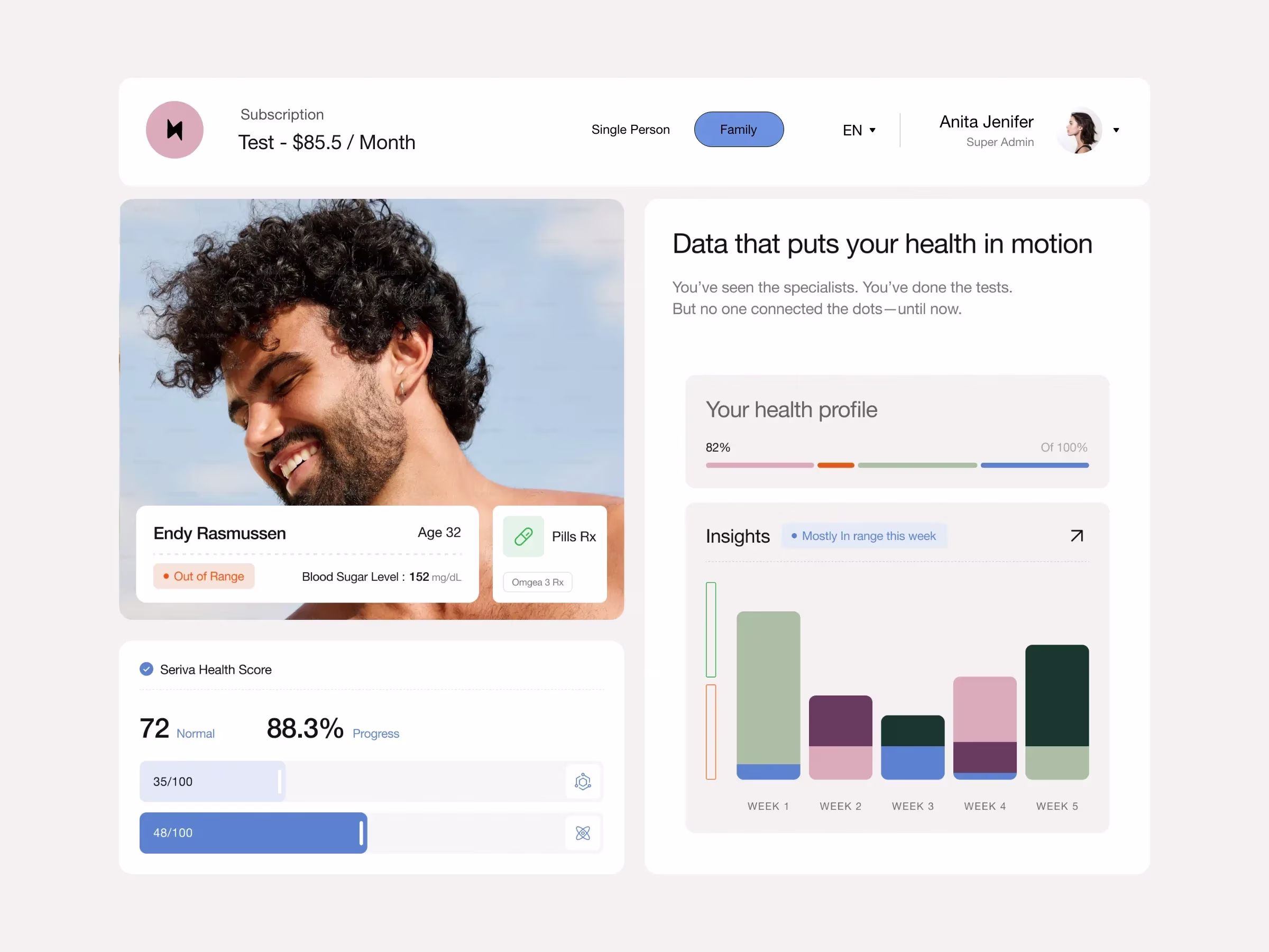 Seriva is designed for products that allow users to decode, track, and take control of their health through biomarker lab testing, medical insights, and digital consultations.