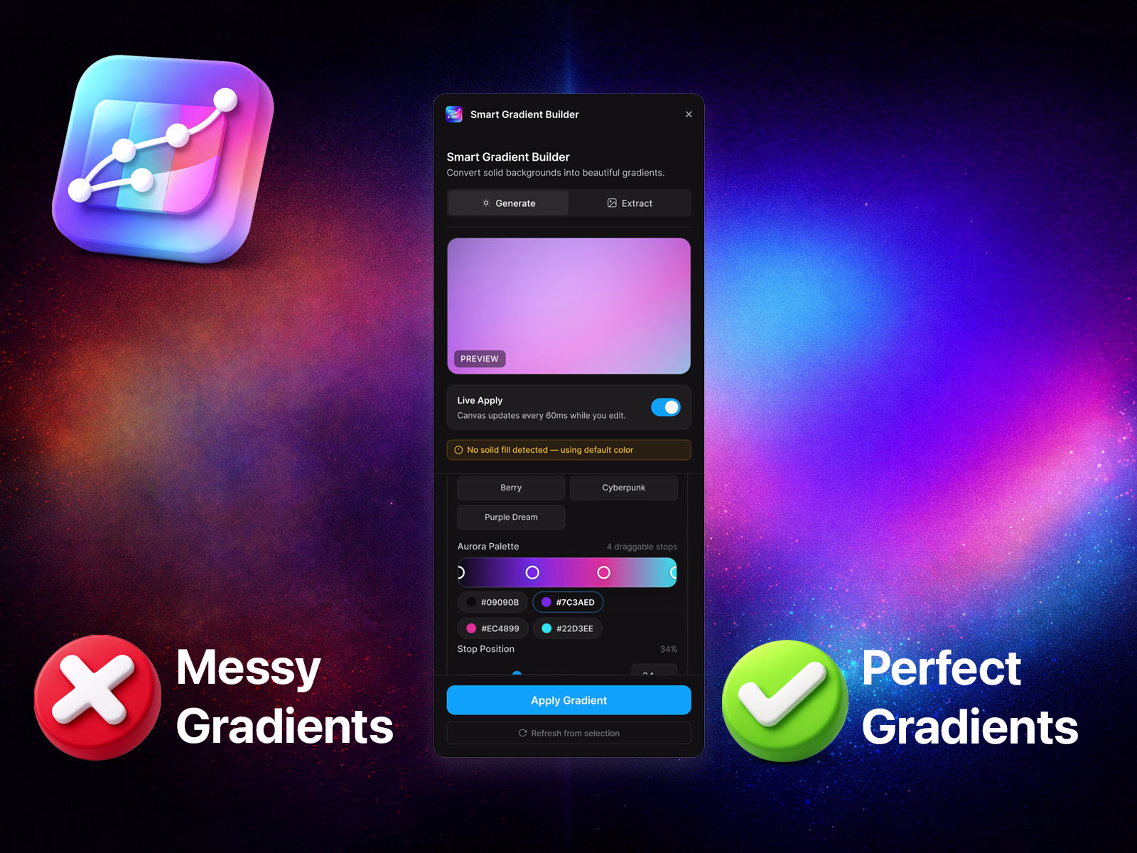 A Framer plugin for building and applying smart gradients on canvas elements. Create linear, radial, glow, and aurora-style mesh gradients with style presets, extract gradients from images, and apply them to selected Framer nodes.