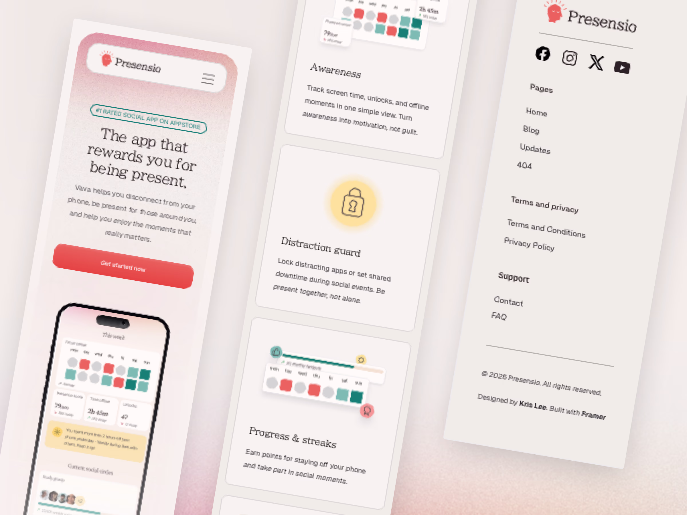 Presensio is a sleek and modern Framer template built for apps and digital products that want to stand out. It uses soft gradients and characteristic fonts to elevate the design. All in a conversion-focused layout.