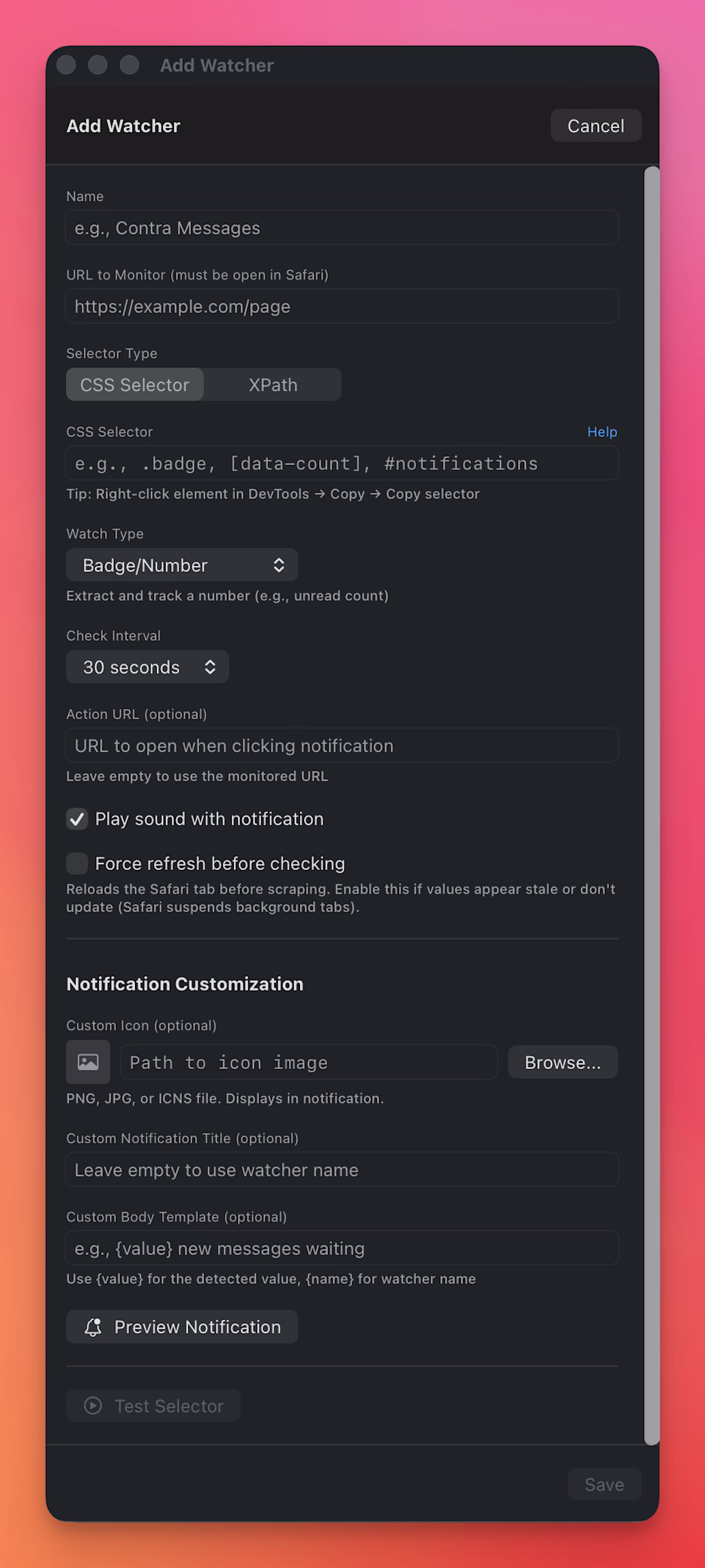Monitors any element via CSS selectors or XPath. Notification badges, message counts, inbox items.
