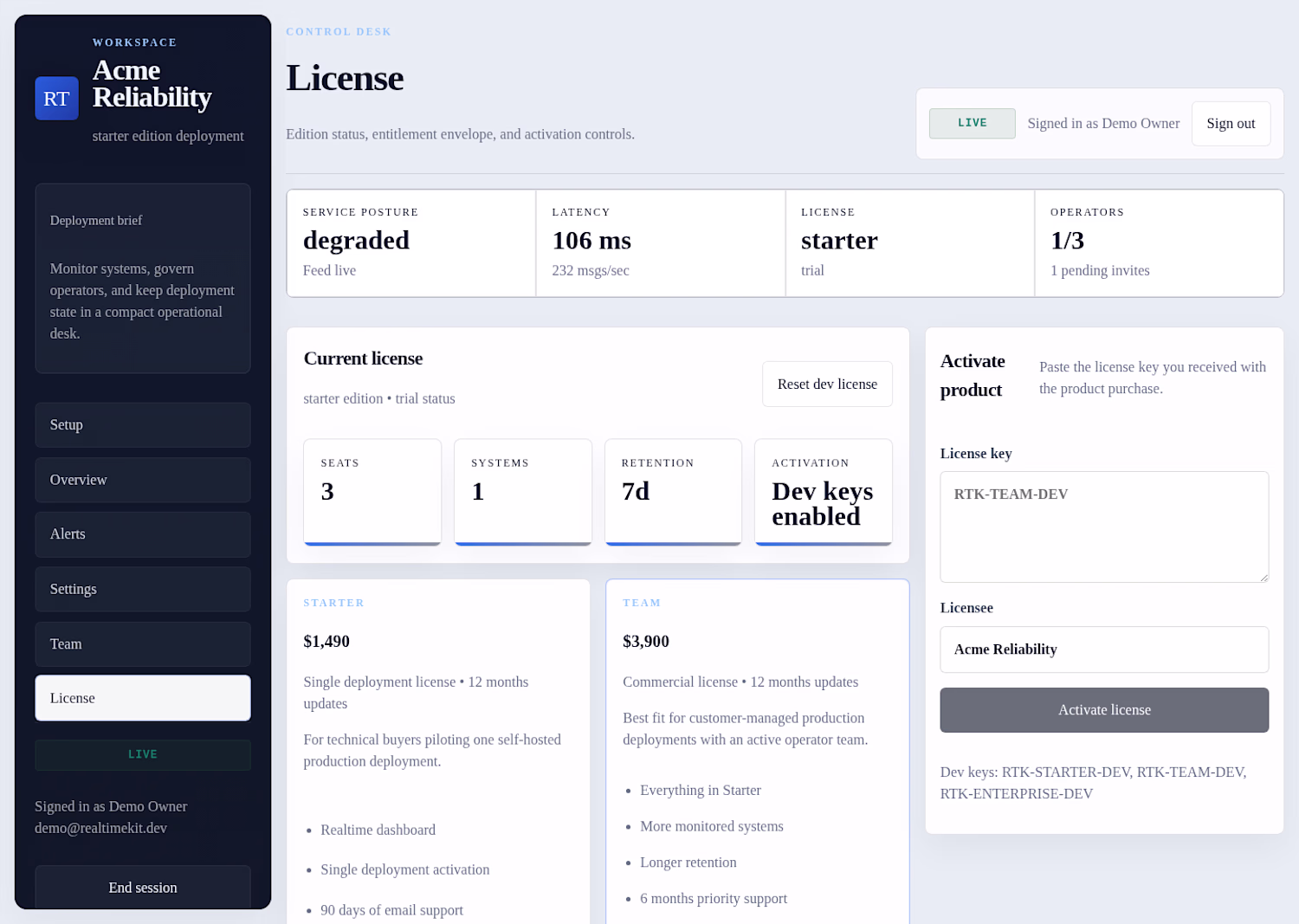 It gives you a production-ready foundation for internal dashboards and operational tooling, including core app structure, authentication, team management, deployment checks, licensing support, and a setup flow built for real deployments.