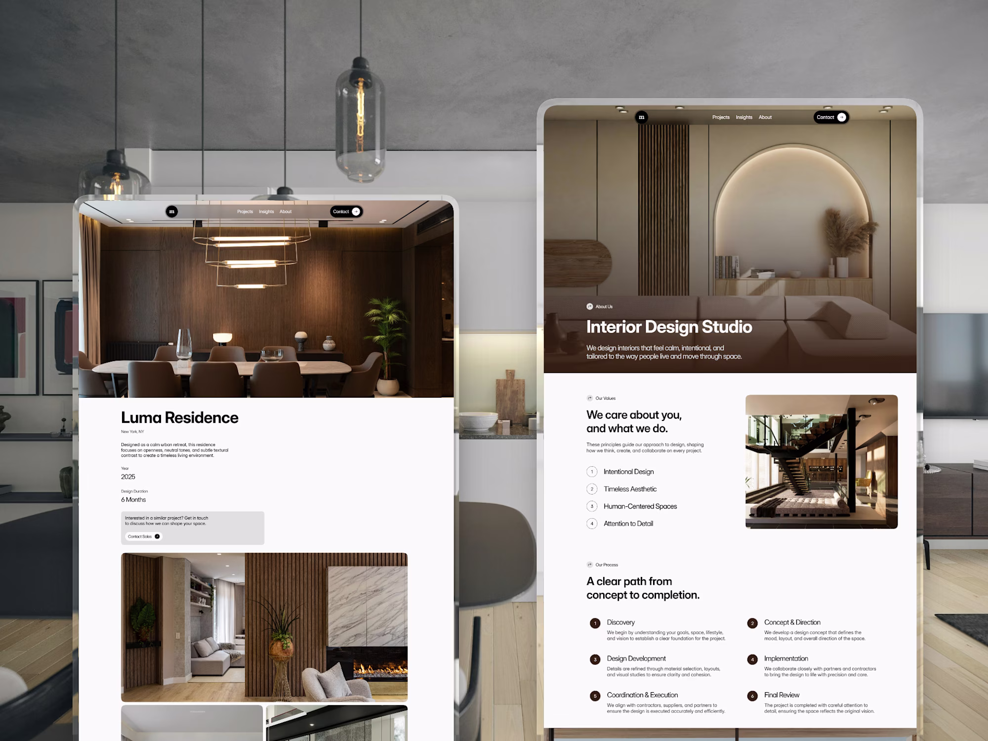 Clear Studio Positioning – Every section is arranged to communicate your design approach, values, and signature style without visual noise.