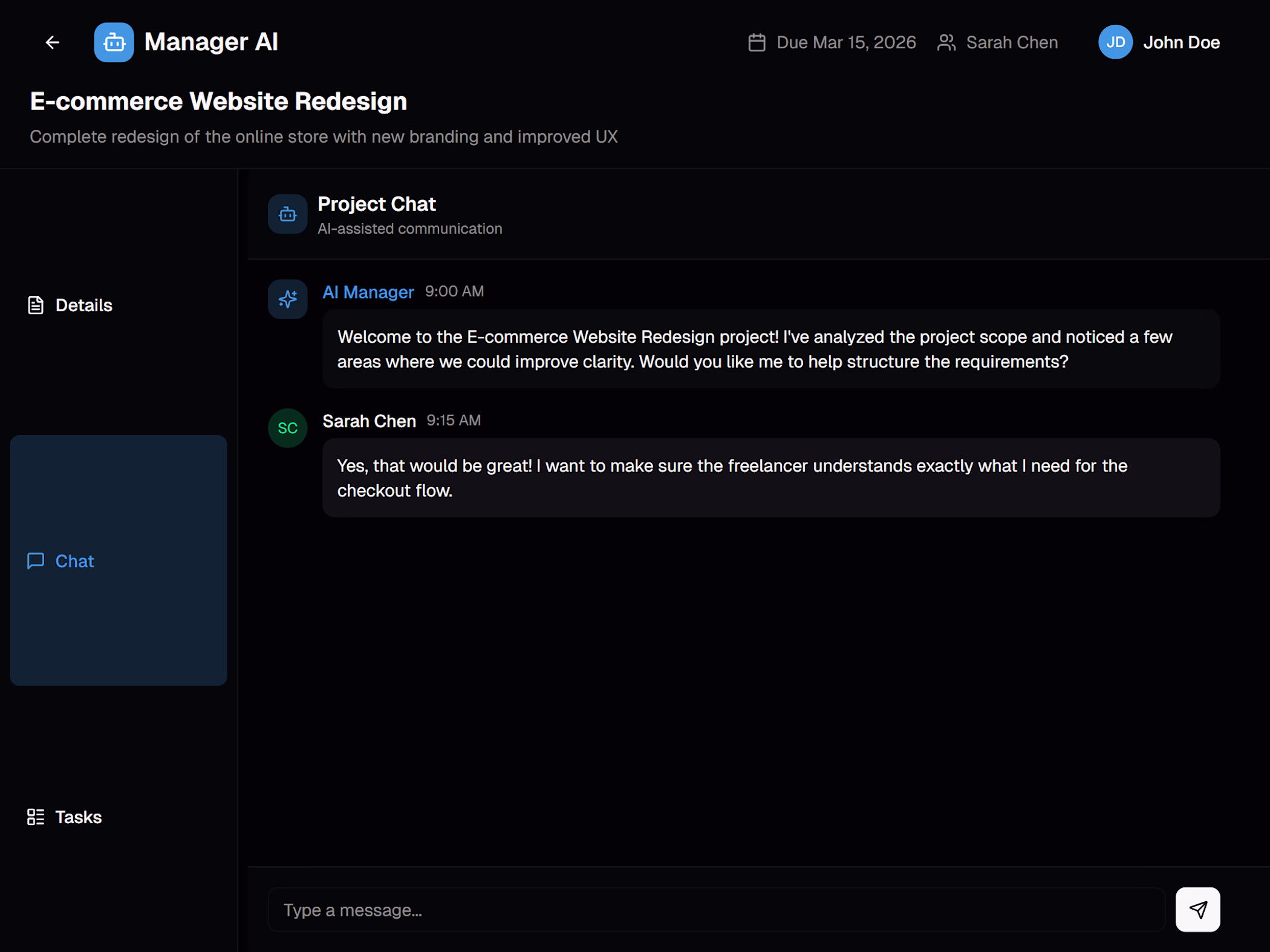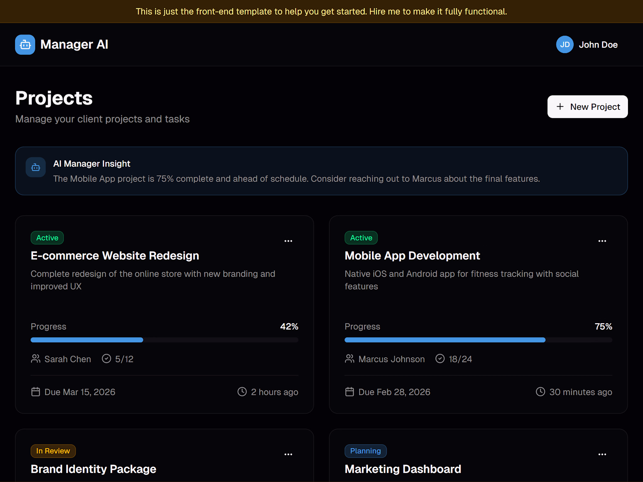 A complete frontend template showcasing an AI-powered project management interface. Built with Next.js, React, and Tailwind CSS.