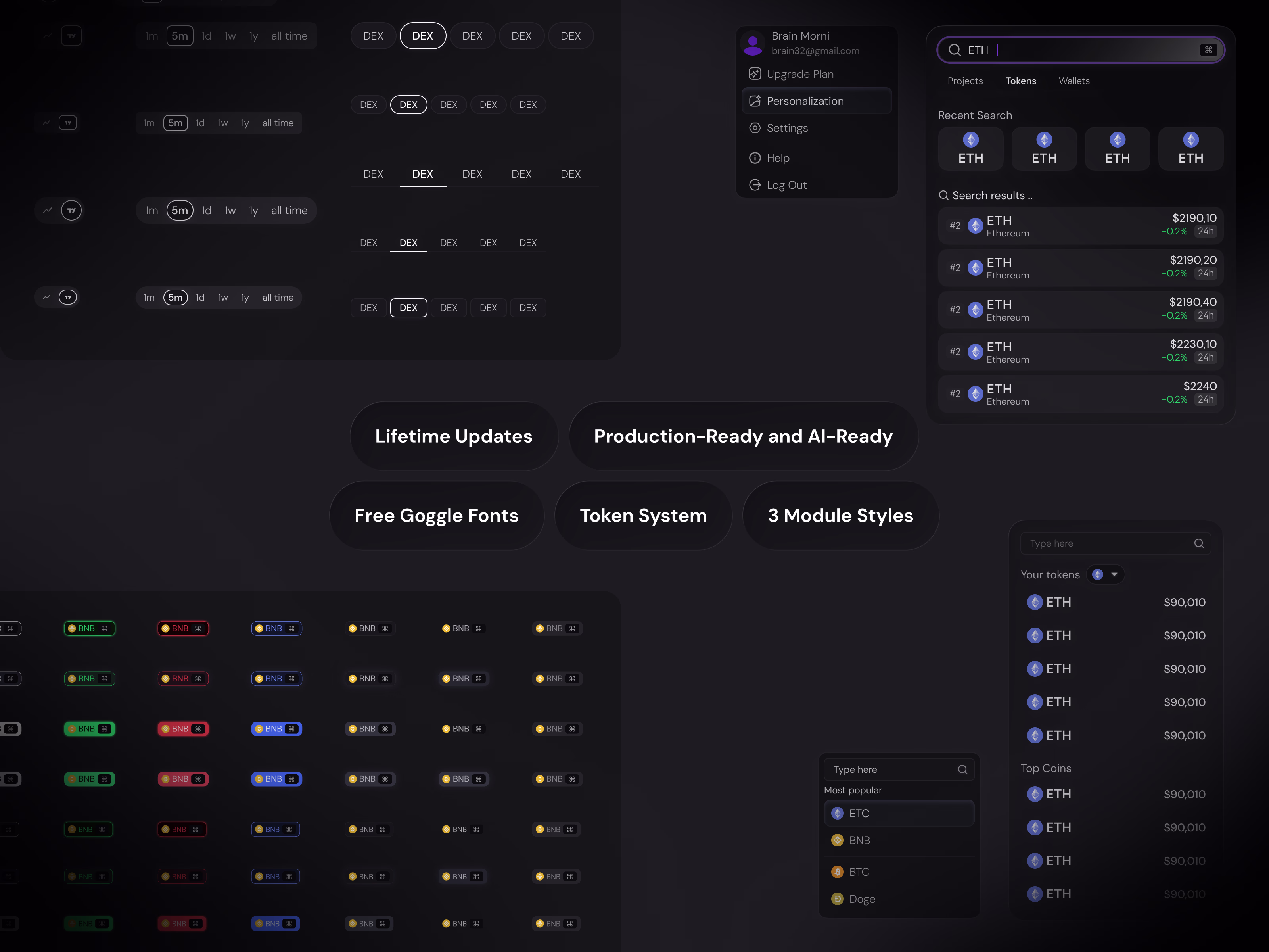 Every module has a swappable base — Dark, Glass, or Light. Change the style once and the entire module adapts. No rebuilding. No duplicates. Built on 100+ Figma Variables covering color, spacing, radius, blur, and typography.