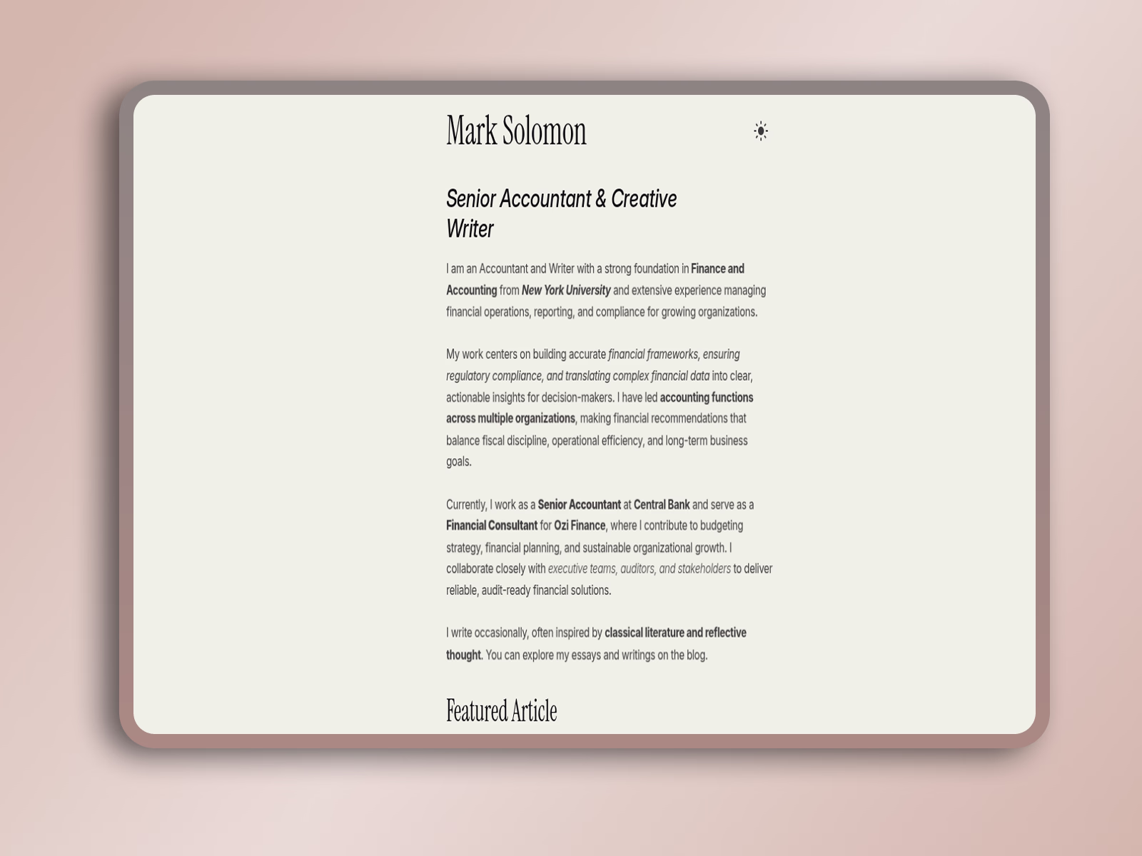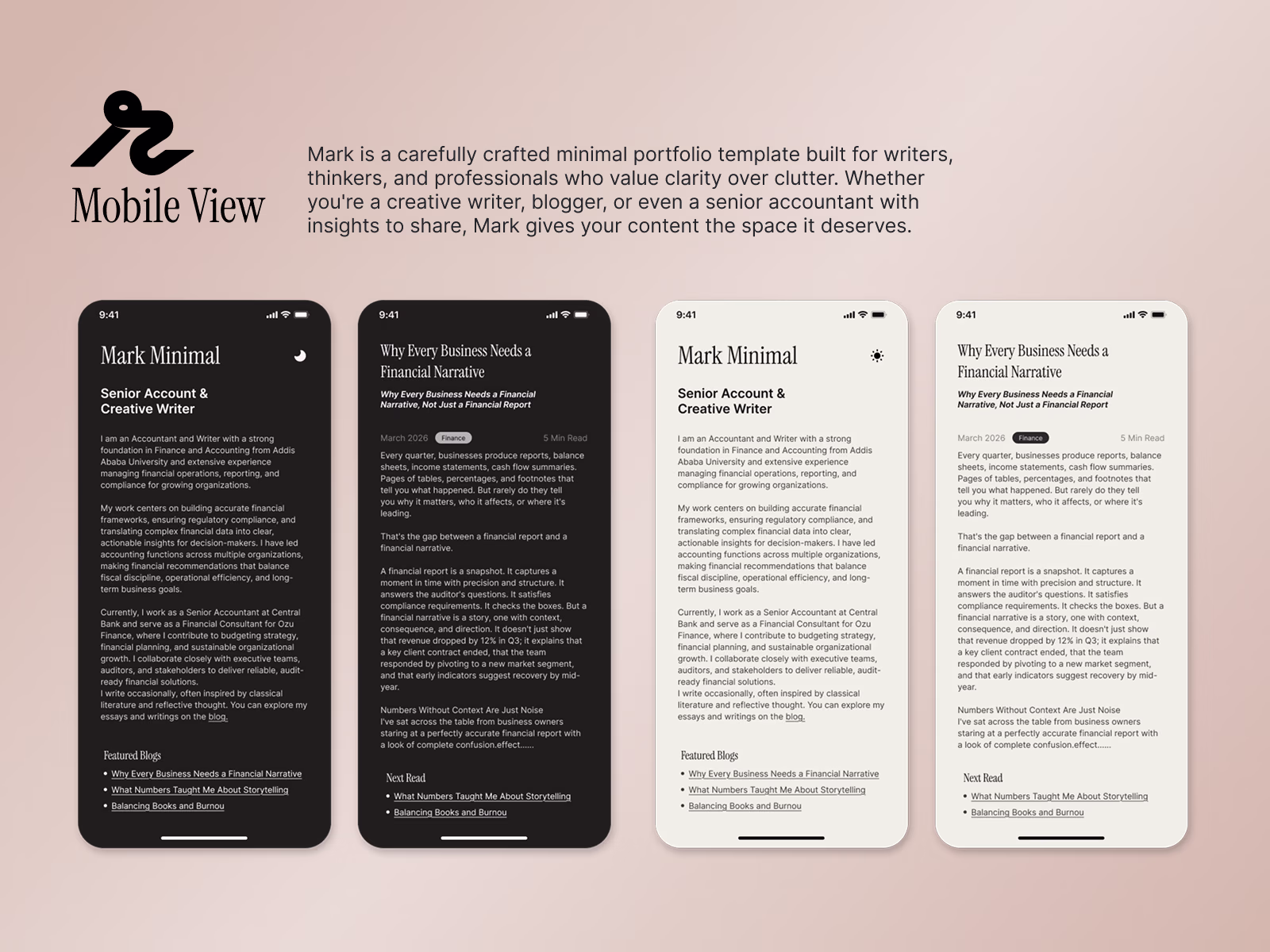 Mark is a carefully crafted minimal portfolio template built for writers, thinkers, and professionals who value clarity over clutter. Whether you're a creative writer, blogger, or even a senior accountant with insights to share, Mark gives your content the space it deserves.