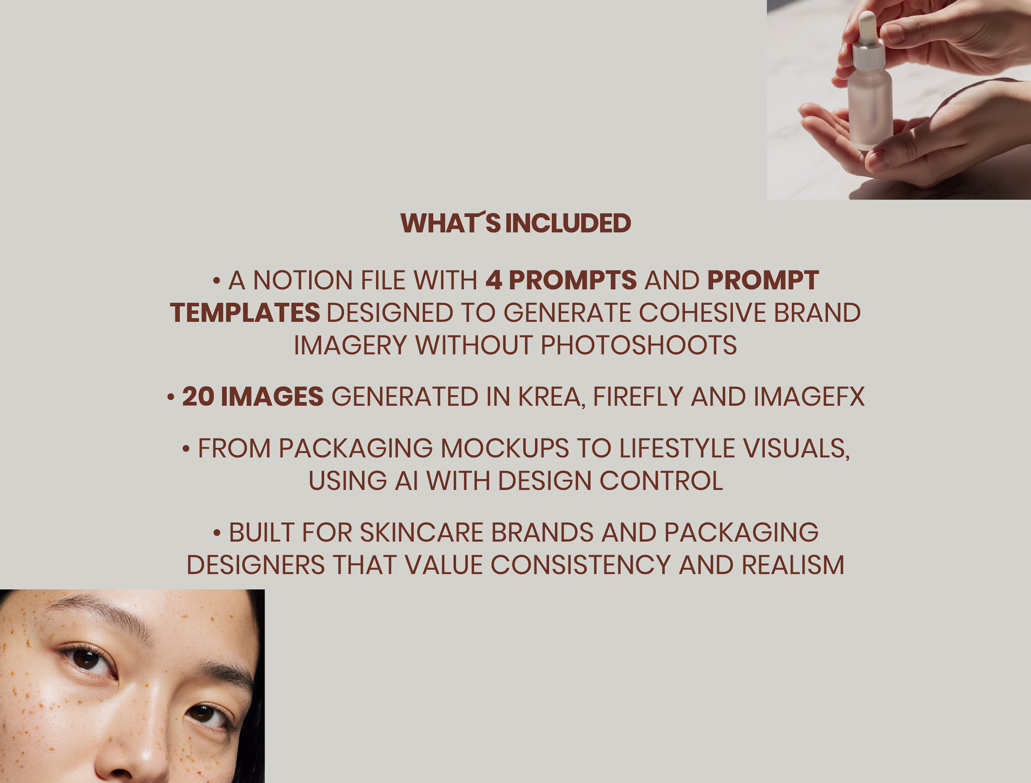 AI image generation is becoming standard, but without direction it often produces generic results. This kit focuses on art direction, material realism, and consistency, helping brands generate visuals that feel intentional and usable across websites, social media, and product launches.