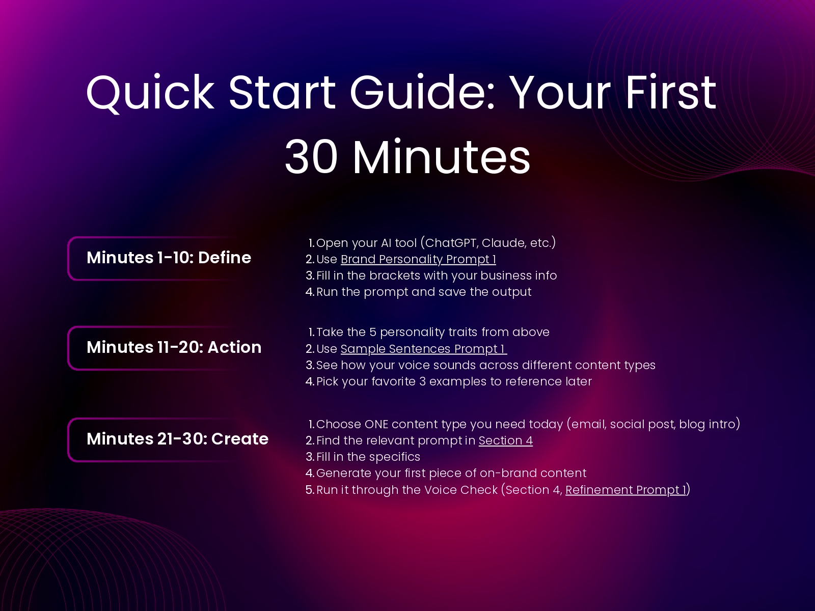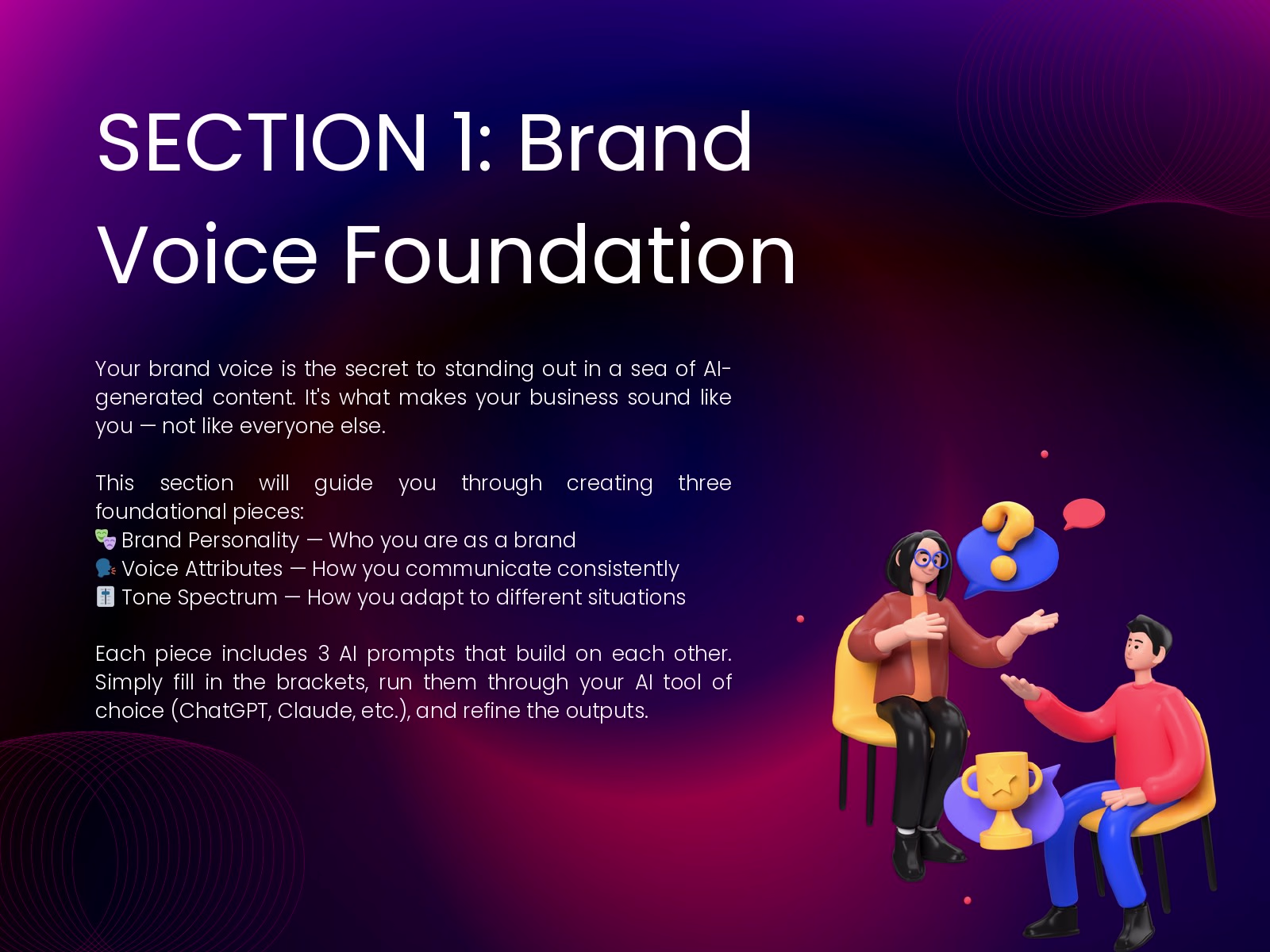The Brand Voice & SEO Content System is a comprehensive AI-powered workbook with 30 copy-paste prompts that teach you to define your unique brand voice, then use AI to create unlimited, on-brand, SEO-optimized content in 70% less time for a fraction of the cost.