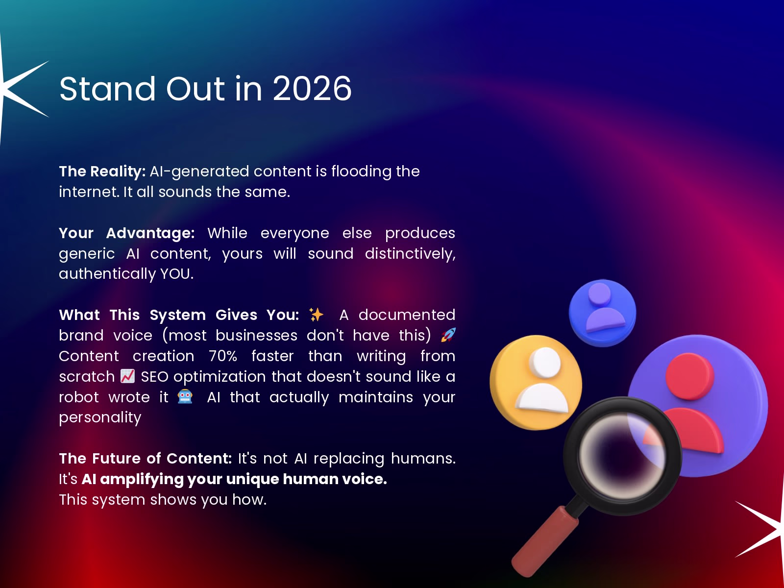 In 2026, when everyone's using AI, and everything sounds the same, this system helps solopreneurs, agencies, and content creators stand out with personality-driven content that ranks on Google and sounds authentic to YOU and your brand.