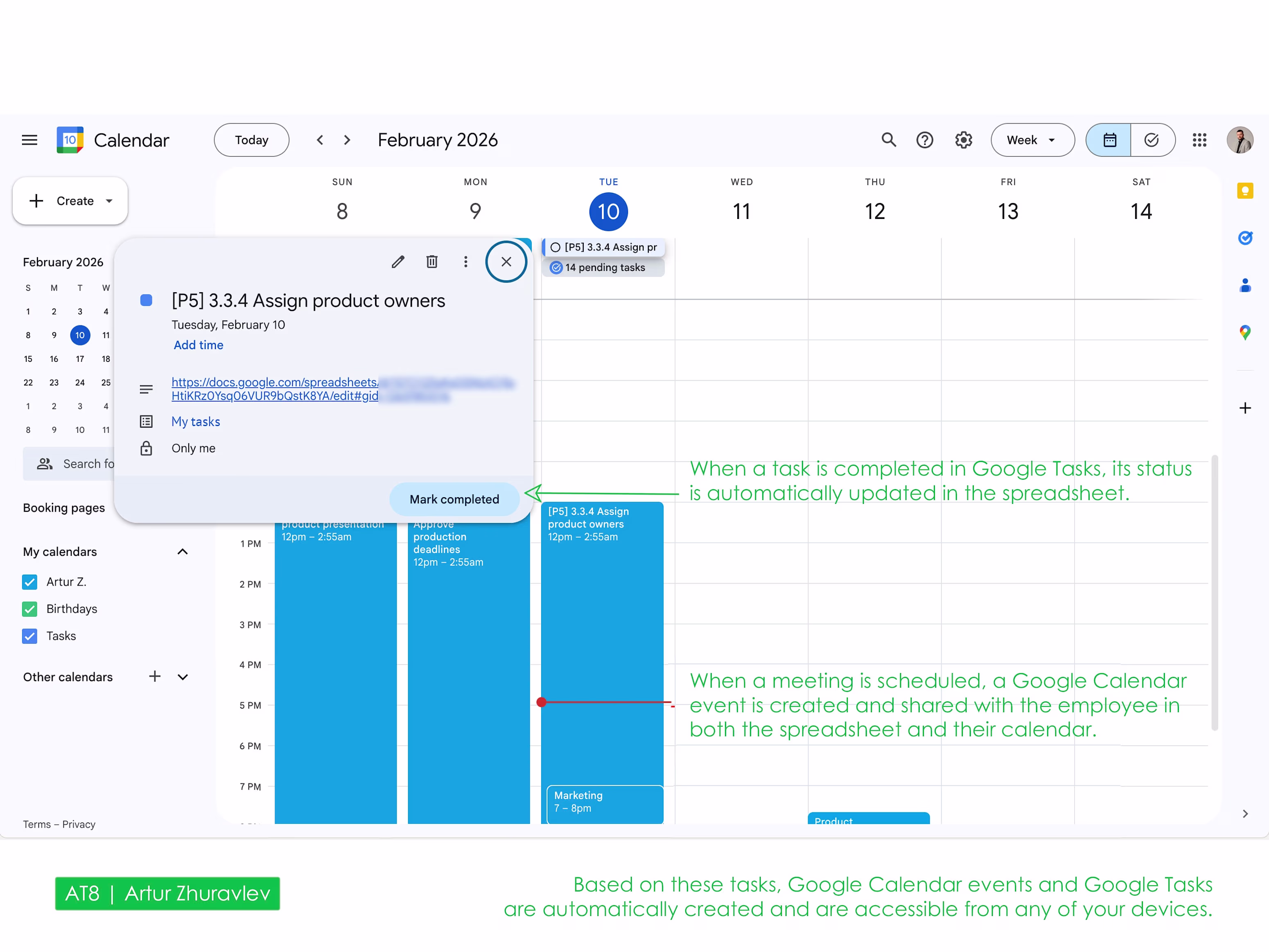 Task statuses synchronized across both sheets and executable directly from Google Tasks