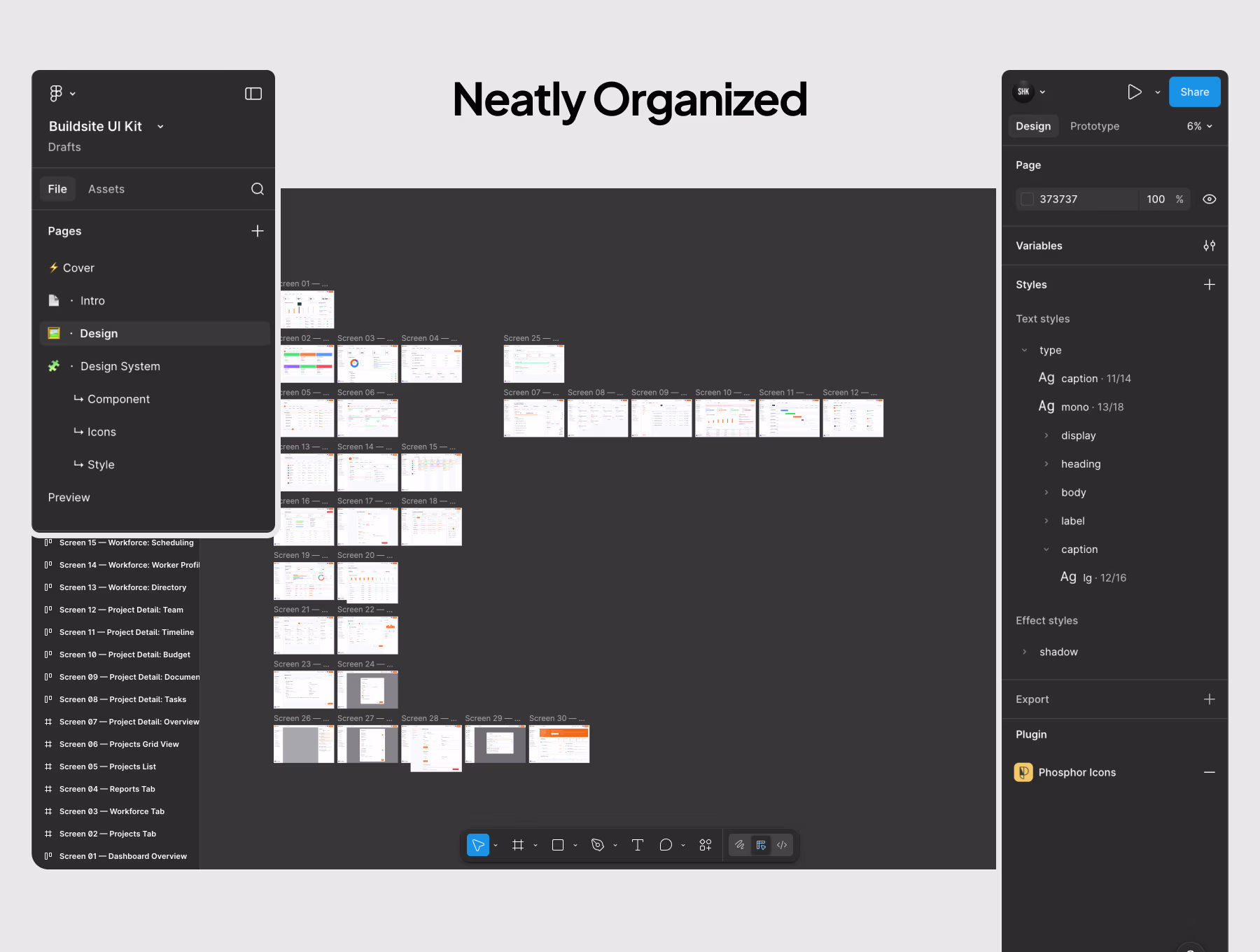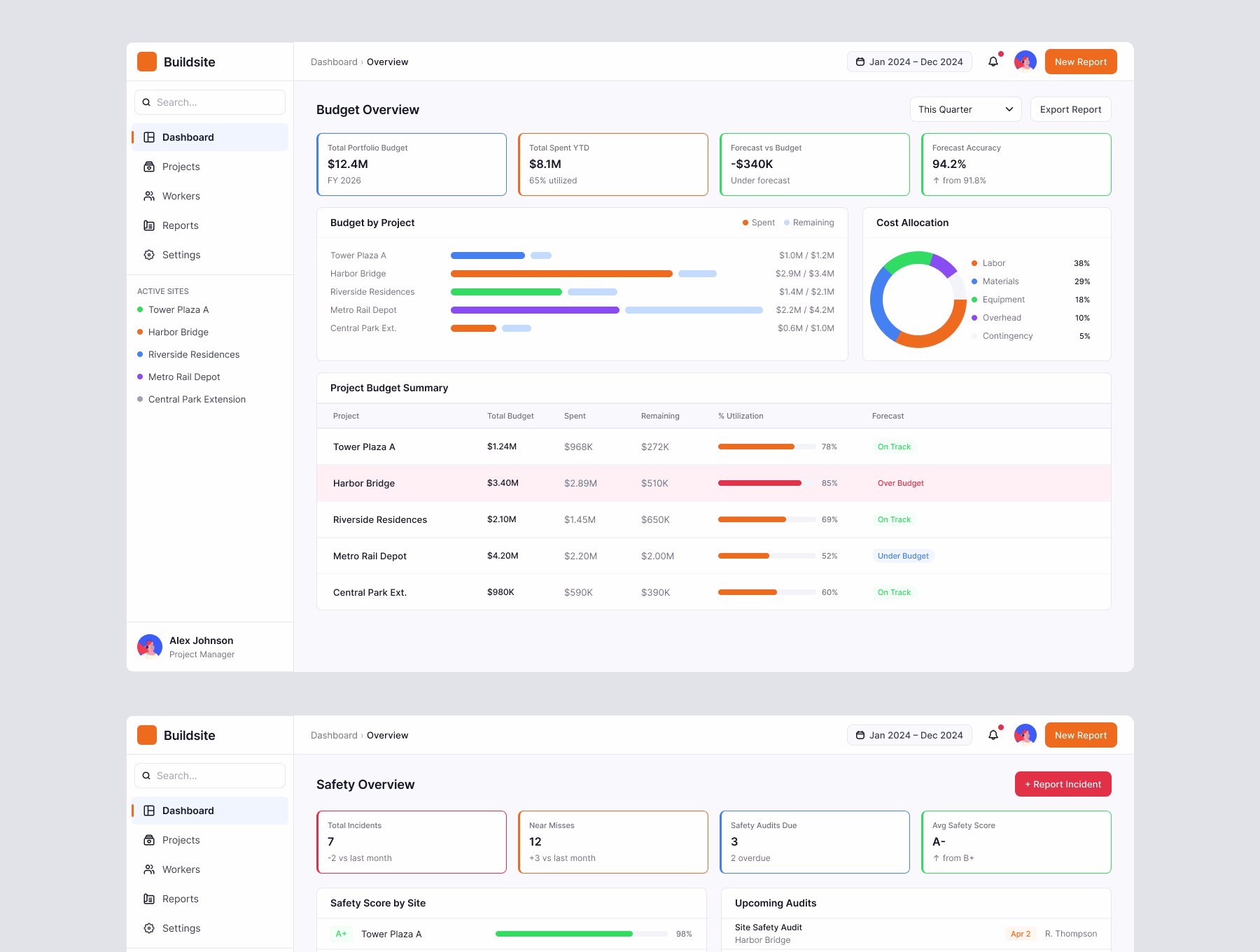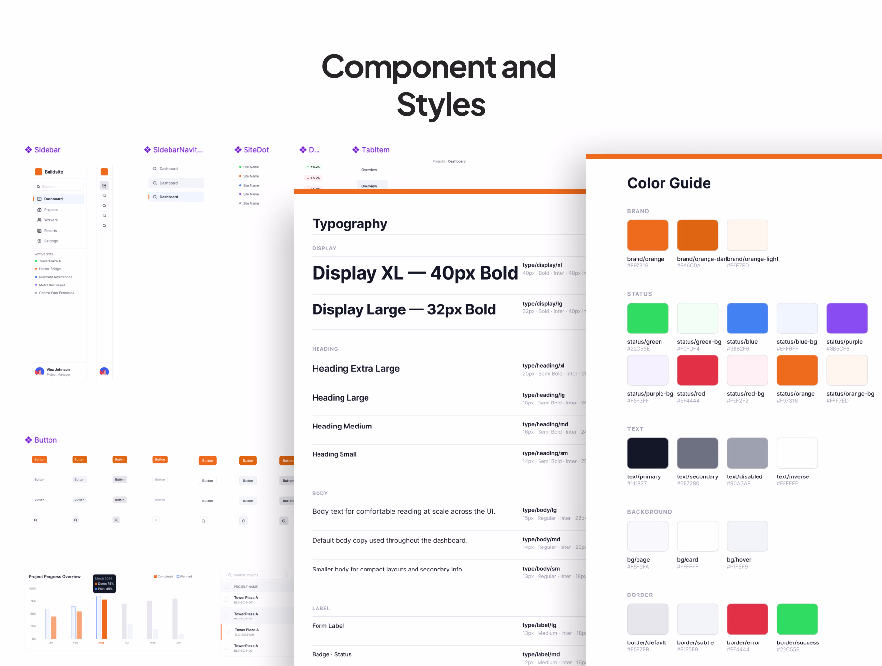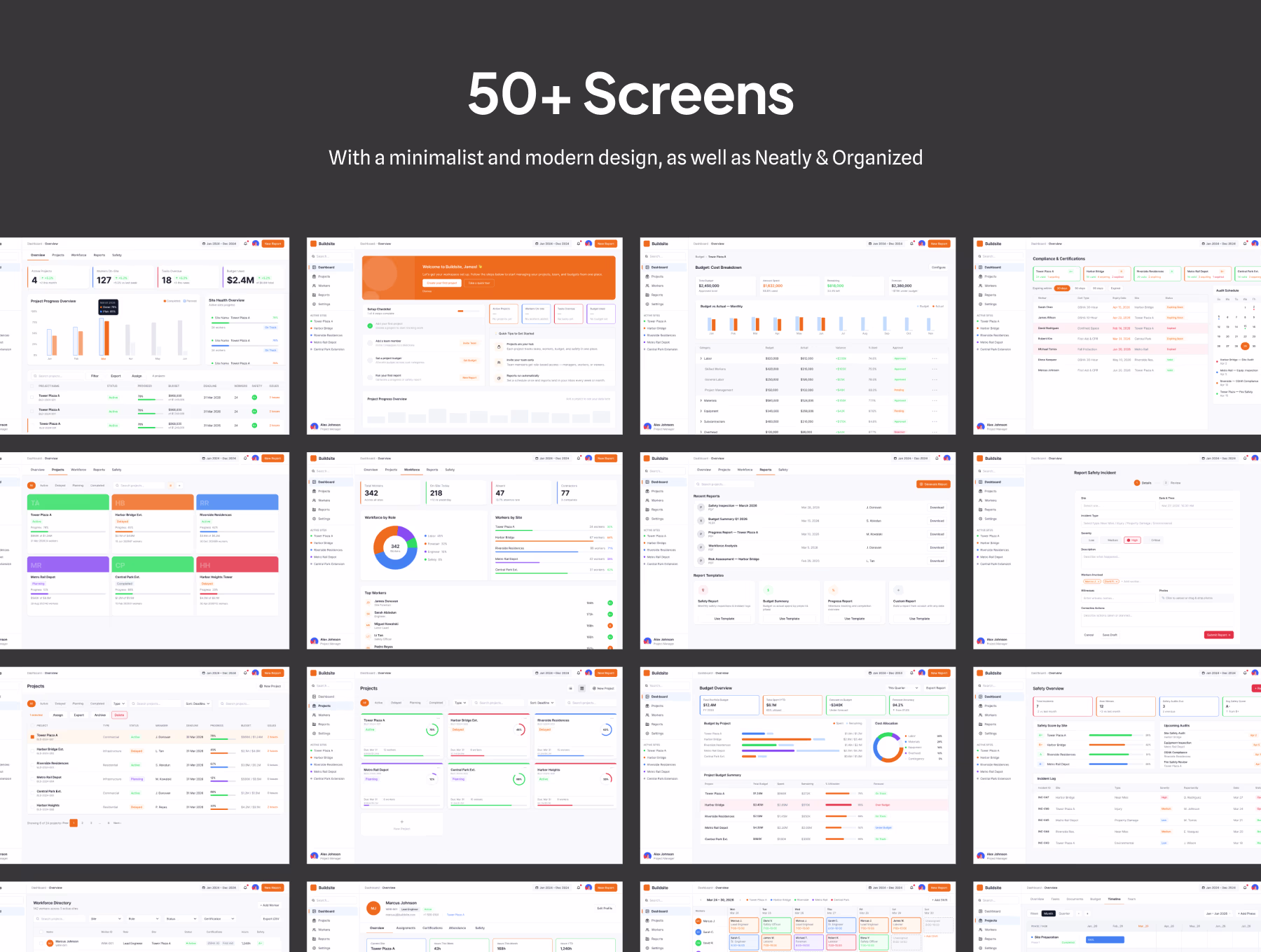 From site-level KPIs to workforce tracking and budget analytics, the kit includes 30 pixel-perfect screens covering project overviews, safety monitoring, document management, report generation, and team management. Every screen is built on a consistent 12-column grid with a full set of semantic color tokens, status systems, and micro-interaction specs — ready for immediate Figma implementation.