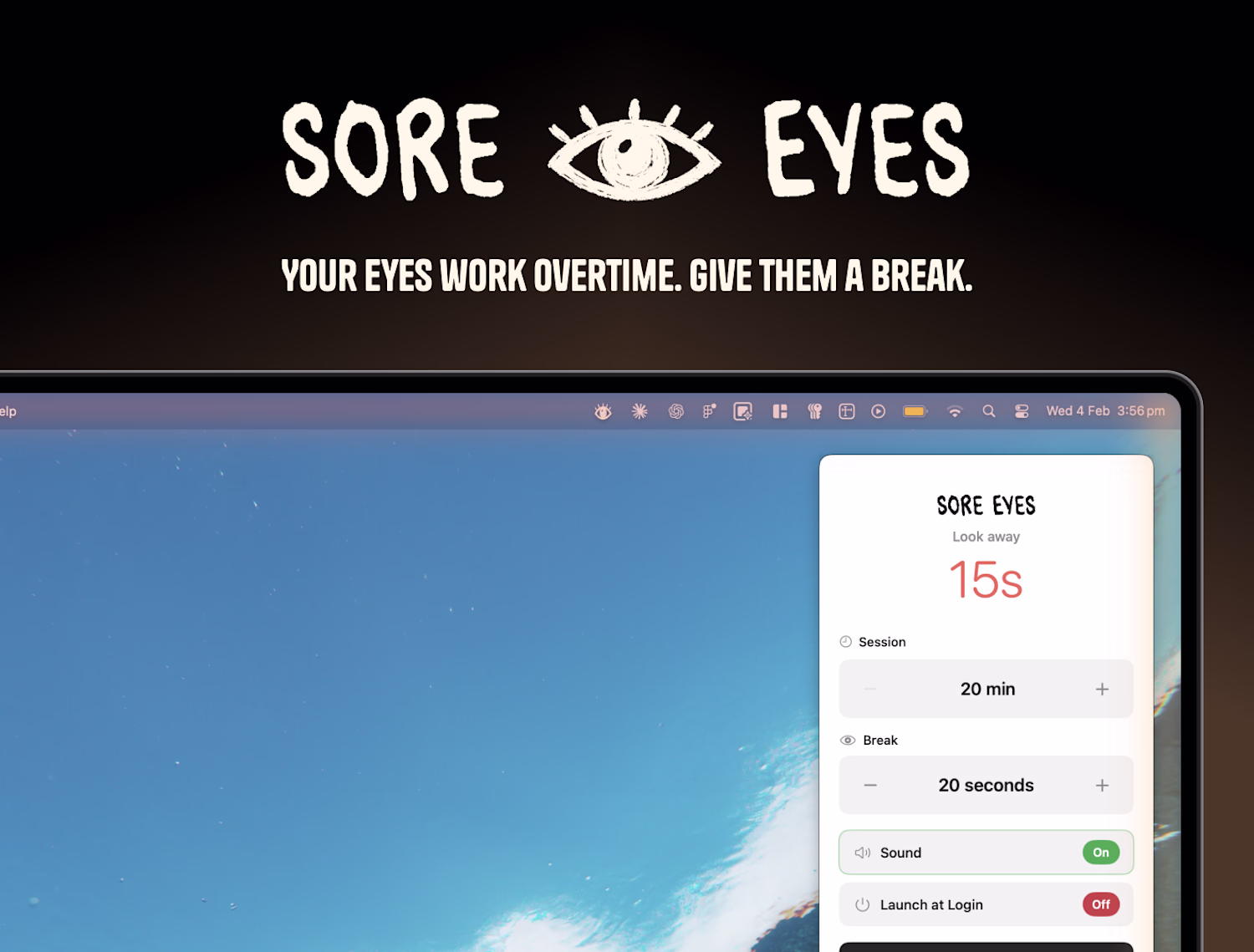 Based on the 20-20-20 rule (every 20 minutes, look at something 20 feet away for 20 seconds), Sore Eyes lives in your menu bar and reminds you to give your eyes the micro-breaks they're desperately begging for.