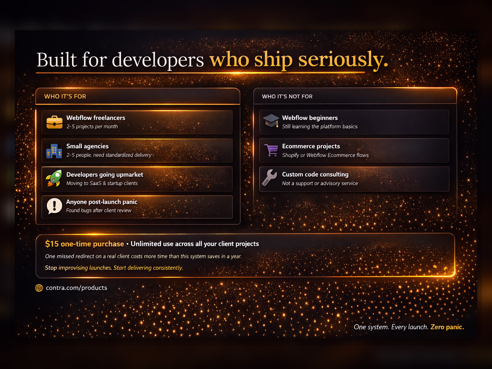 Webflow freelancers and web developers taking 2–5 projects per month who want to stop reinventing their process every time
