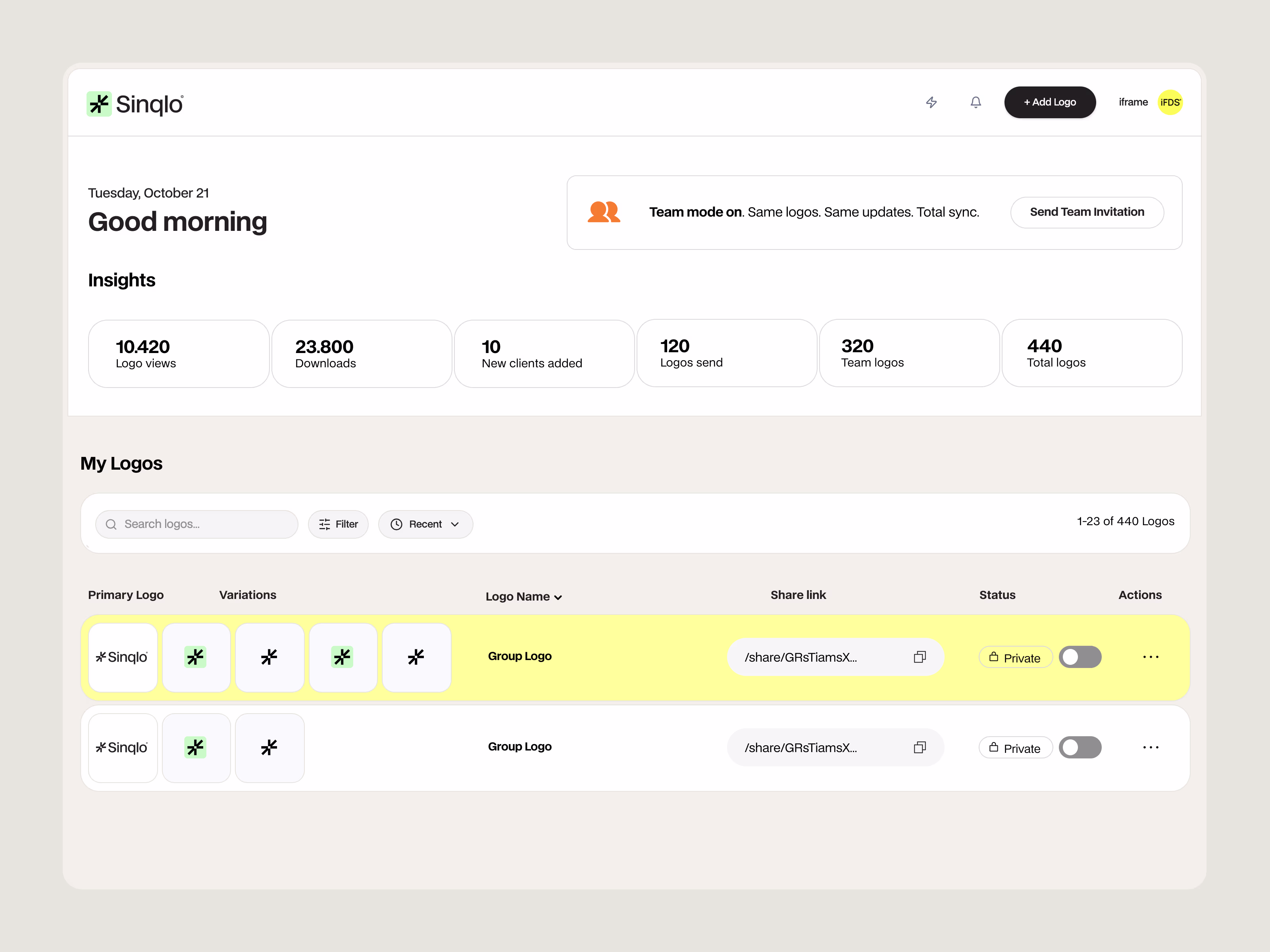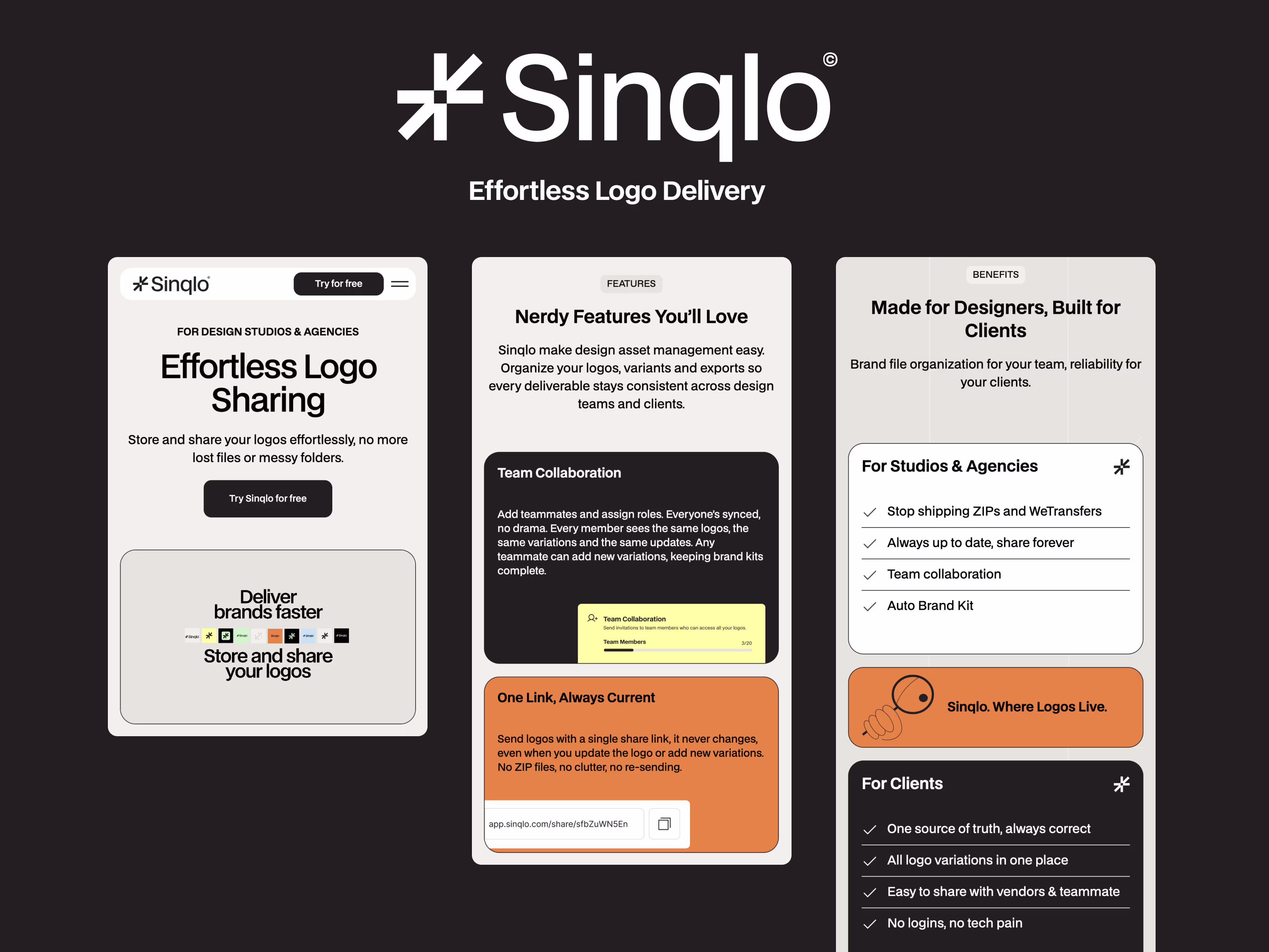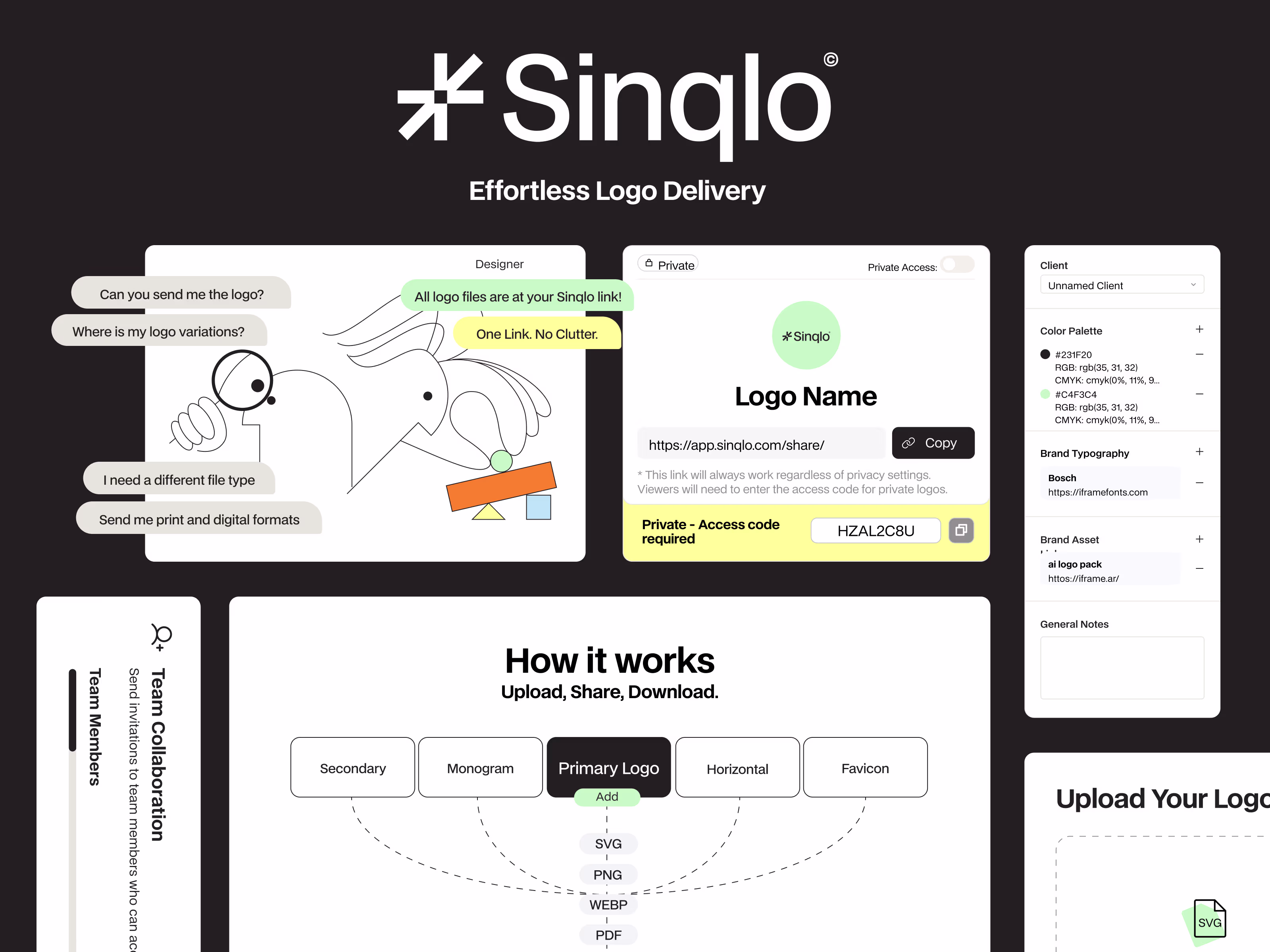 one live link that holds everything a client needs: logos, brand kits, color palettes, fonts, photos, guidelines, and external brand-system links always updated, always accessible.