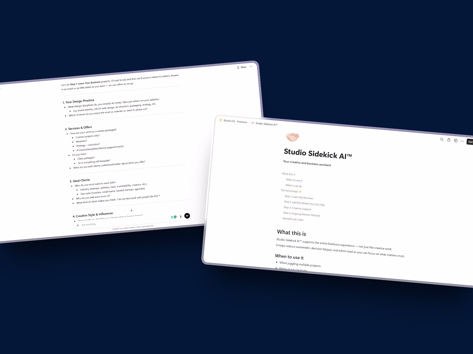 Studio OS is a curated set of professional-grade AI prompts built specifically for freelance digital designers — helping you streamline your workflow, protect your brand work, and show up more confidently in your business.