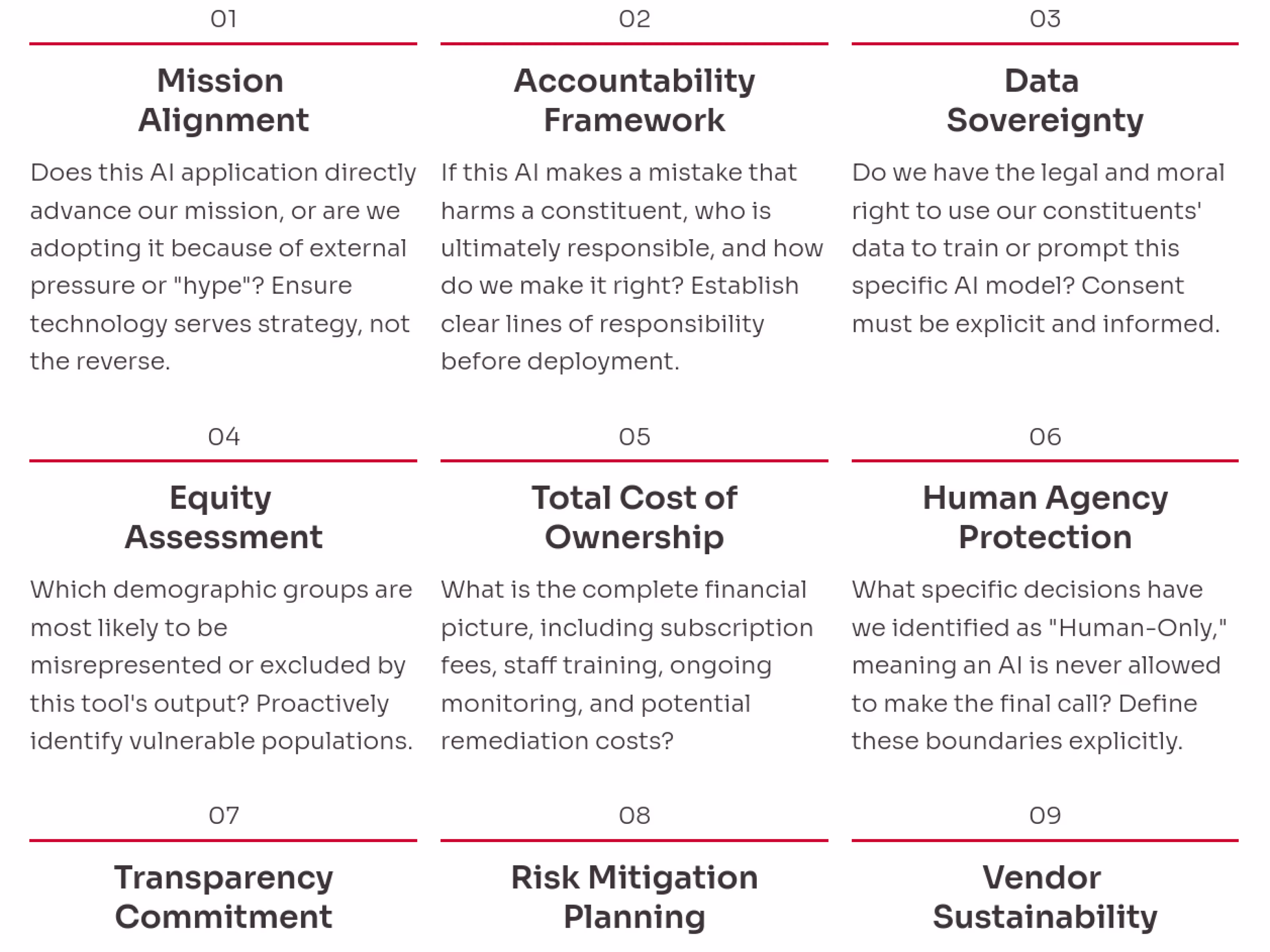 We cover 50 targeted questions across Mission Alignment, Data Sovereignty, Algorithmic Bias, Governance, and Staff Culture.