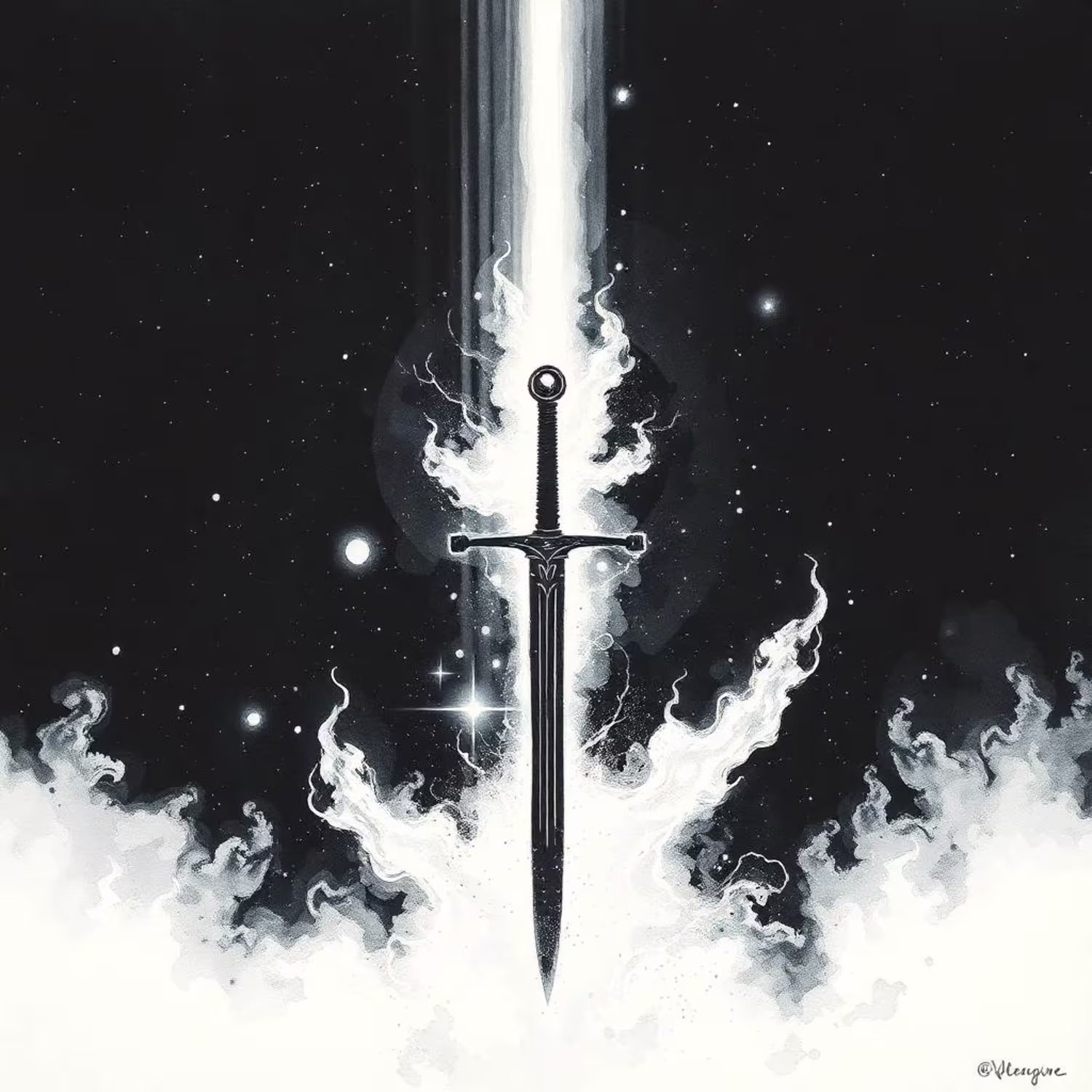 Watercolored Dark Black Glitched Sword with Comets Encircling It