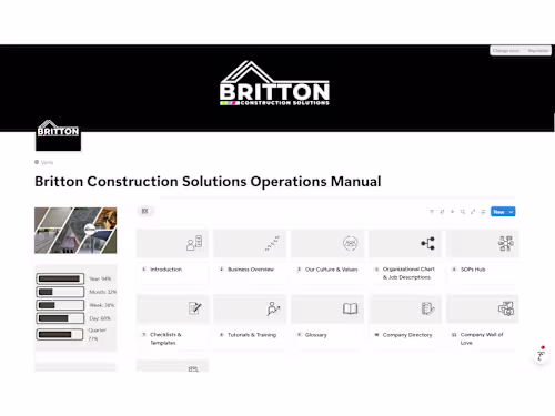 Some sections we typically include in our clients' custom-built operations manuals: - Introduction - Business Overview - Culture & Values - Organizational Chart & Job Descriptions - SOPs Hub - Checklists & Templates - Tutorials & Training Center - Client Resources Library - Owner's / Management's Hub - Glossary - Company Directory - Company Wall of Love - New Hire Onboarding Quizzes