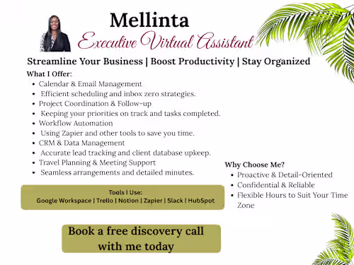 Are you overwhelmed by managing emails, meetings, and daily tasks? I’m here to streamline your workflow and give you back valuable time. As an experienced executive virtual assistant, I specialize in calendar management, email management, travel planning, and project coordination using top tools like Google Workspace, Microsoft Office 365, Trello, Asana, ClickUp, Slack, Zoom, and Microsoft Teams. In addition, I’m proficient with advanced tools such as CRM systems, HubSpot, Zapier for workflow automation, Evernote/Notion for knowledge management, LastPass for secure password management, and QuickBooks for basic financial tracking. These tools enable me to support complex projects, automate routine tasks, and maintain smooth communication across teams. With a keen eye for detail and proactive communication, I help busy executives stay organized, meet deadlines, and maintain smooth business operations, all remotely. My goal is to anticipate your needs, solve problems before they arise, and support your success. Let’s connect and see how I can make your workday easier and more productive. Click my profile to get started.