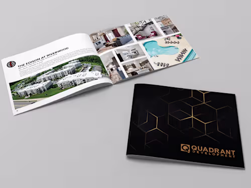 A professionally designed 36-page print and digital booklet for Quadrant Development, showcasing properties with custom layouts, aerial photography integration, and modern brand-driven design. Includes creative direction, page architecture, typography, and press-ready production files.