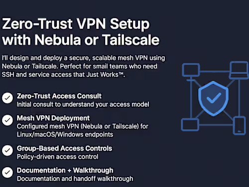 Full VPN setup using either Nebula or Tailscale, configured for your environment (Linux/macOS/Windows).