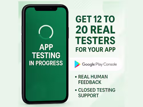 Deliverables: ✅ 12 to 20 Real Human Testers (using real Gmail accounts and Android devices) ✅ App Download and Installation Reports (confirmation that testers joined your closed test) ✅ Bug Reports / Issue Feedback (optional, if you request tester observations) ✅ Screenshots or Short Videos from Testers (optional, for proof of testing) ✅ Summary Report (optional, a simple document summarizing testers' feedback and findings)