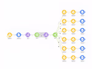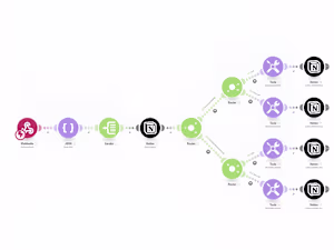 Connected tools (e.g., Notion, Google Docs, Relevance AI) integrated with custom logic such as create/update conditions, filters, or data routing paths.