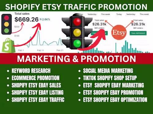 Dear Buyer, Let me manage both your Etsy and Shopify stores, handling all aspects of marketing and promotion to reach targeted customers worldwide. I deeply understand both platforms and am confident I can provide a complete marketing strategy that drives SALES" results on both. Are you a Dropshipper or Shopify store owner? Is it difficult for you to get more traffic to your Shopify store, or are you getting traffic but no sales? Worry no more, as I will help you with my complete Shopify sales funnel. This will let you gain more traffic worldwide from Google and social media platforms and convince visitors to buy from you, turning traffic into SALES".