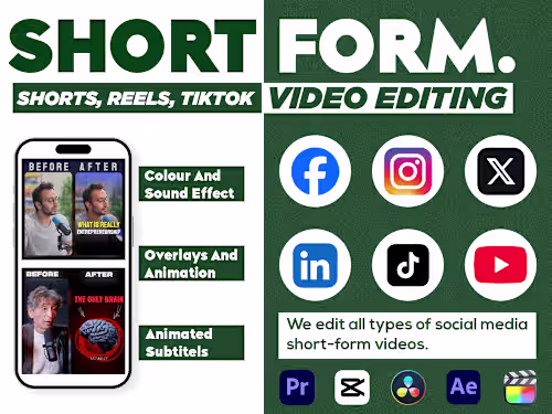 Professional Podcast Video & Audio Editing for Social Media: Are you looking to elevate the quality of your podcast for social media, personal, or business purposes? I offer top-tier video and audio podcast editing services that will transform your recordings into polished, professional content. With nearly two decades of experience in podcast production, I specialize in making your podcast sound and look its absolute best. I’ll remove unwanted parts, background noise, and add custom intros, outros, and motion graphics—delivering a high-quality, engaging final product for your audience. My Podcast Editing Services Include: Cutting unnecessary parts for a smooth flow Custom UHD background creation Trimming, merging, and resizing Sound enhancement, noise reduction Color grading and correction Adding intros, outros, and transitions (provided by you) Text, Captions, and exclusive lower thirds Motion graphics, etc I’ve produced thousands of episodes for clients worldwide, ensuring professional sound and video quality. If your podcast is audio-only, I can create video files for platforms that require them. Choose the tier that suits your needs, or ask for a custom plan!