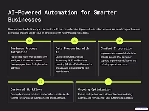I can automate repetitive tasks such as data entry, email handling, document processing, scheduling, customer support, lead qualification, and other workflow operations tailored to your business needs.