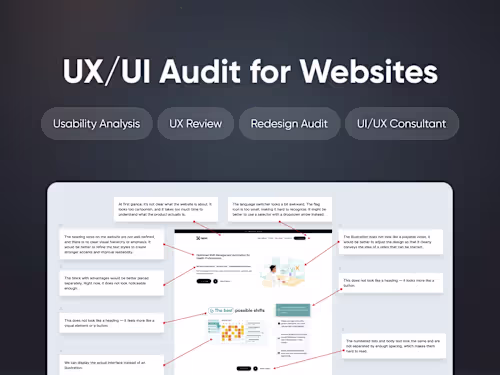 1) Block-by-block UX/UI analysis (from hero section to footer) 2) Detailed feedback on visual style, layout, hierarchy, spacing, typography, and consistency 3) Identification of usability issues, friction points, and weak trust signals 4) Concrete redesign recommendations, not abstract advice 5) Curated examples of high-quality websites (including outside your industry) to help define a strong, modern, and credible visual direction 6) Alternative design approaches for key sections, with explanation of why each approach works 7) Suggestions for improving or expanding the logical structure of the page where needed 8)If you have Hotjar, Google Analytics, or other tools, I can analyze real user interactions through session recordings, heatmaps, and collected user feedback to validate assumptions, identify pain points, and uncover opportunities for improvement.