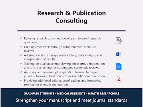 Training on qualitative interviewing (semi-structured), focus group moderation, and article screening for scoping and systematic reviews.