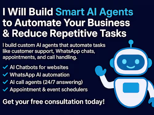 Are you tired of handling repetitive tasks or slow customer responses? I build smart, custom AI agents that help your business run faster, smoother, and more efficiently. With advanced automation, your AI agent can chat with customers, answer common questions, book appointments, handle WhatsApp conversations, manage calls, collect leads, and more — all while saving you time and increasing productivity. ** What I Can Build for You ** 1. AI Chatbots for websites 2. WhatsApp AI automation 3. AI call agents (24/7 answering) 4. Appointment & event schedulers 5. Lead generation & CRM integrations 6. Troubleshooting / support assistants 7. Custom workflow automations Let’s automate your tasks, boost efficiency, and help your business grow. Get your free consultation today!