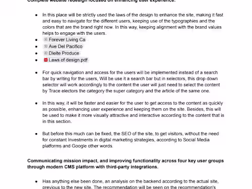 You will get Google Docs to comments your questions in real-time, plus else like PDF, that content analysis: Backend (CMS, Google Core UX Visual Vitals, Rich Result from Google Search Console *GMB*, Schema Markup XML). SEO (site audit, pages with success, redirections, broken links, blocked pages, SEO issues, domain top pages, top keywords, backlinks, Schema markup meta tags). Social media ads *Meta + LinkedIn*: review of his actual advertising content, headlines, descriptions, primary text, dimensions of the advertising videos, images, and formats *flex/carousels/collections/single content*, destinations of the advertising, with the backend Pixel, API conversions and GTM.