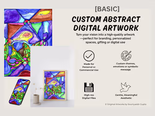 What You’ll Get: 1 Custom Digital Abstract Artwork (Watercolor Original) | High-Resolution JPG/PNG (300 DPI – suitable for small prints and digital screens) | Web-Optimized Version (for easy sharing on socials or email) | 1 Minor Revision (for color or minor adjustments)