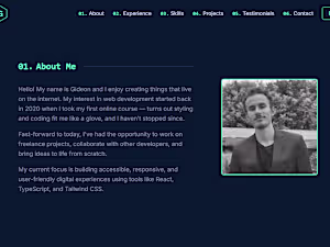 Working with Gideon was great. Communication was clear, and I felt confident that he could deliver. He created my Portfolio, and within 2 weeks I got the job that I wanted. I would highly recommend him to anyone going for their dream job.