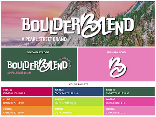 Defined primary and secondary colors with HEX, RGB, and CMYK codes.