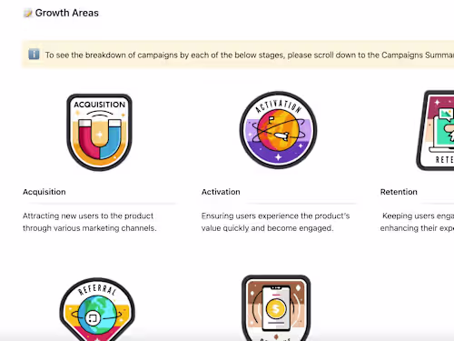 - Campaign Breakdown - Experimentation Setup - Onboarding Audit - Upgrade Flow Audit - Cancellation Flow Audit - ICP and User Personas - Messaging and Positioning - Data Tracking Plan - Lifecycle Email Strategy