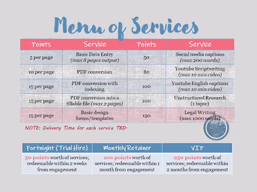 I offer legal research and drafting of legal documents, including demand letters and affidavits. Additionally, I provide data entry and organization services, translation of legal documents between English and Tagalog, social media caption writing, and basic layout and design tailored to your needs. Please view the Menu of Services on my profile to select from a range of tasks available.