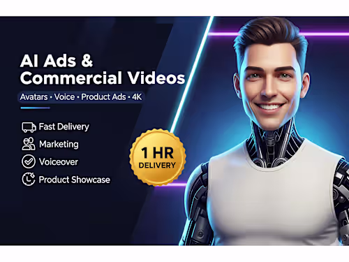A fully edited, cinematic AI commercial video tailored to your brand or product. Includes avatar(s), professional voiceover, subtitles, background music, and visual effects. Delivered in MP4 format (HD or 4K).
