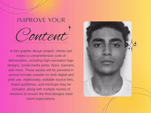 Final Logo Design: A high-resolution logo in multiple formats (e.g., PNG, JPEG, SVG, EPS) suitable for both print and digital use, including color, black-and-white, and transparent background versions. Social Media Posts: Professionally designed social media graphics, optimized for platforms like Instagram, Facebook, and Twitter, delivered in the required dimensions and formats. Flyers/Brochures: Print-ready and digital versions of flyers or brochures, provided in high-resolution PDF format and any other requested formats. Banners: Custom-designed web or print banners, delivered in the appropriate sizes and formats, optimized for display on websites, social media, or print. Source Files: Editable design files (e.g., Adobe Illustrator, Photoshop) for logos, posts, flyers, and banners, if requested, allowing for future modifications. Brand Guidelines: A document outlining logo usage, color schemes, typography, and other branding elements, ensuring consistent application across all materials (if requested). Revisions: Up to 3 rounds of revisions to refine and perfect the designs, based on client feedback. Mockups/Previews: Visual mockups or previews to showcase how the designs will appear in real-world settings, such as on products, websites, or print materials.