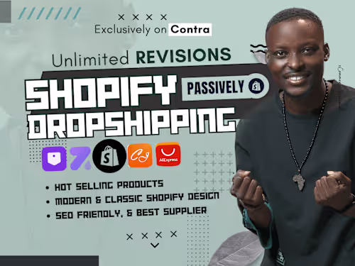 Shopify Store Design & Customization, tailored for successful dropshipping ventures. With a keen eye for design and a focus on user experience, I craft Shopify stores that not only look stunning but also drive conversions. What's Included: Strategic Design: A visually appealing storefront that aligns with your brand and captivates your audience. Customization: Tailored solutions to meet your unique business needs, ensuring your store stands out in the competitive online market. User-Friendly Interface: Smooth navigation and intuitive layouts for an exceptional customer journey. Mobile Optimization: Your store will look flawless on any device, providing a seamless experience for mobile shoppers. SEO Integration: Implementing best practices to enhance your store's visibility and reach your target audience. Dropshipping Integration: Streamlining the process for a hassle-free dropshipping experience. Let's elevate your online presence and turn visitors into loyal customers. Ready to take your Shopify store to the next level? Let's get started!