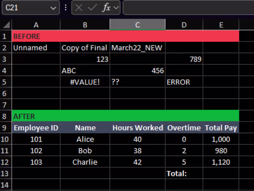 You’ll receive a cleaned and well-organized Excel file with corrected formulas, consistent formatting, renamed sheets (if needed), and simplified structure. Designed to be easier to read, update, and share.
